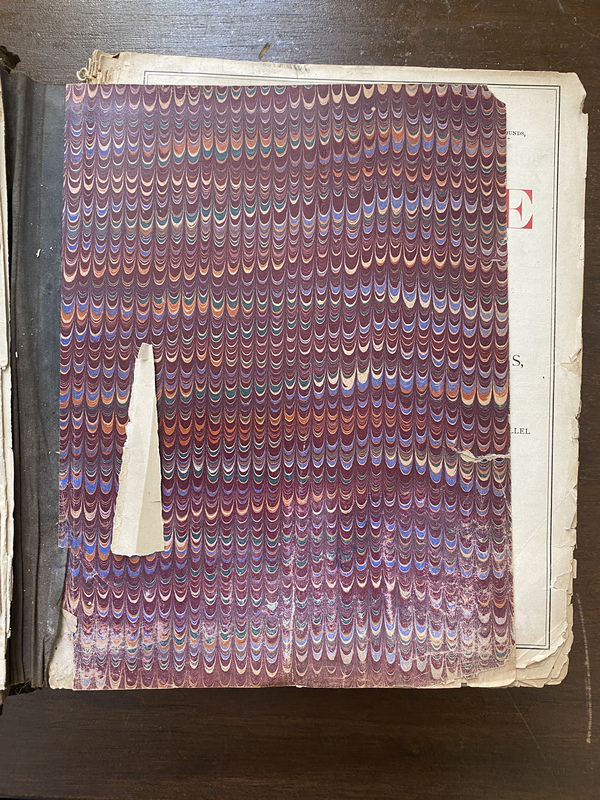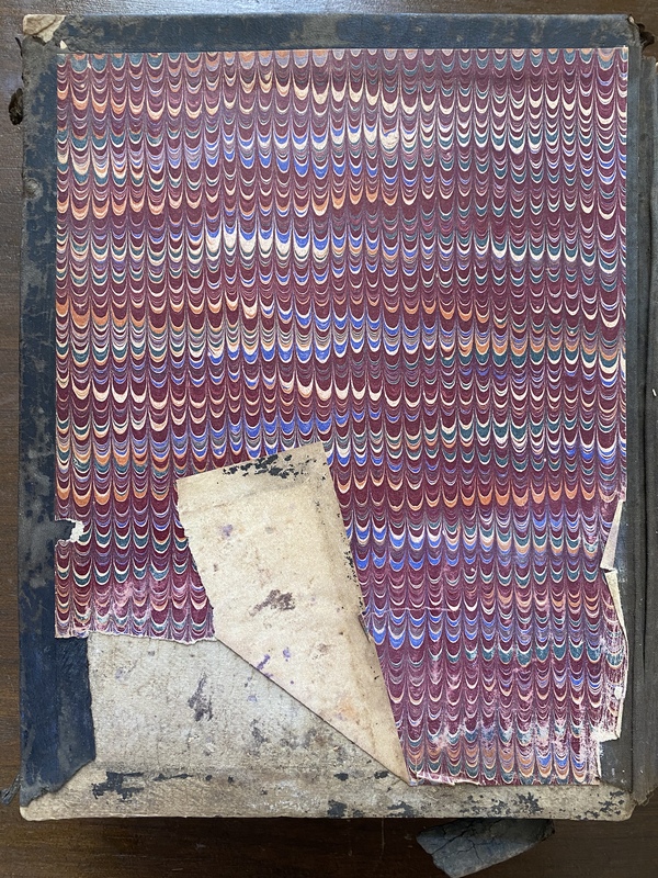 The front cover, along with all front matter, is detached and substantially damaged. The primary sewn binding is holding.