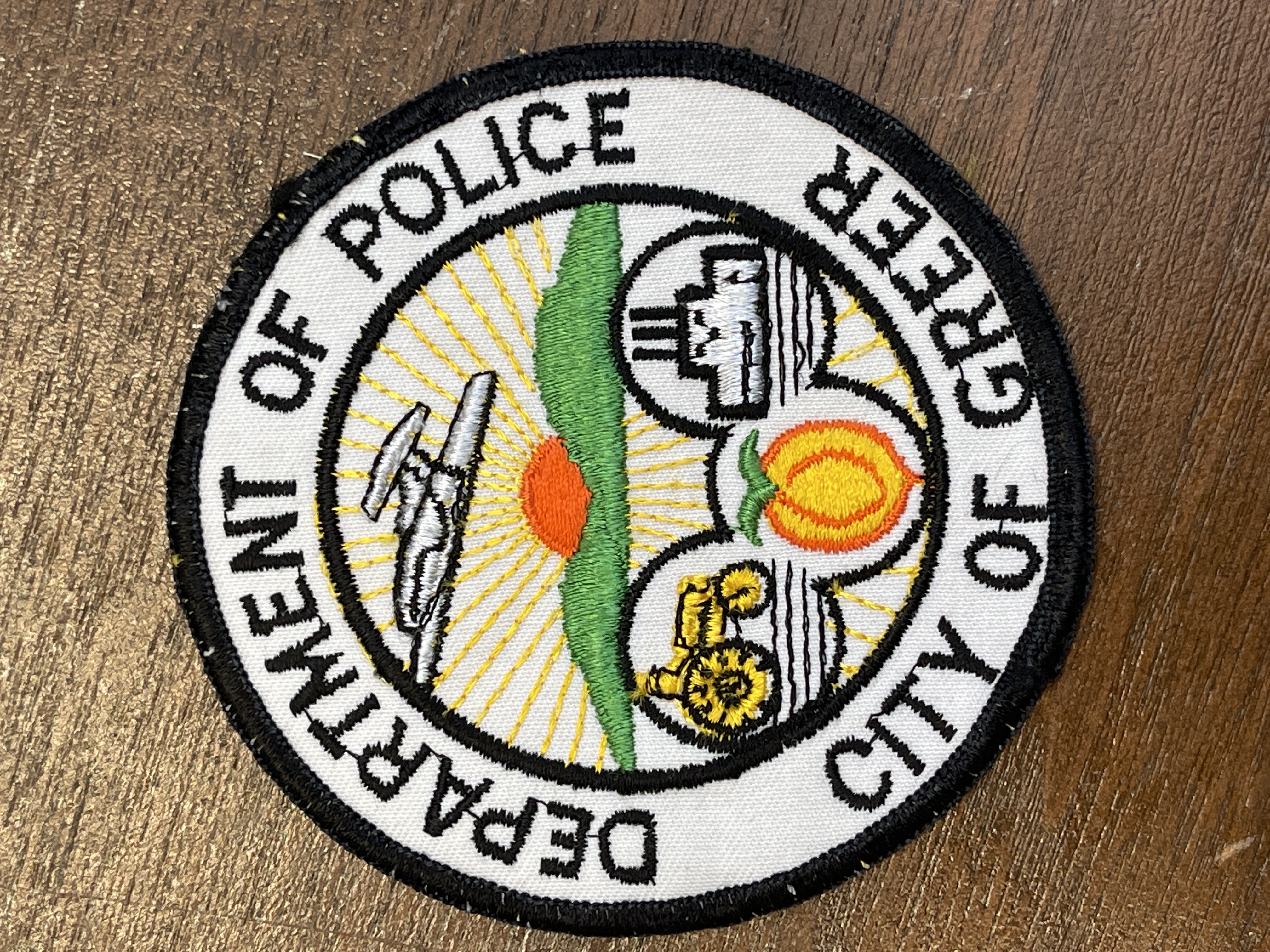 - Police patch from the uniform of Paul Green, used beginning in 1978. White patch, city emblem in center (airplane, sunset over hills, tractor, peach, factory); "Department of Police" above, "City of Greer" below.