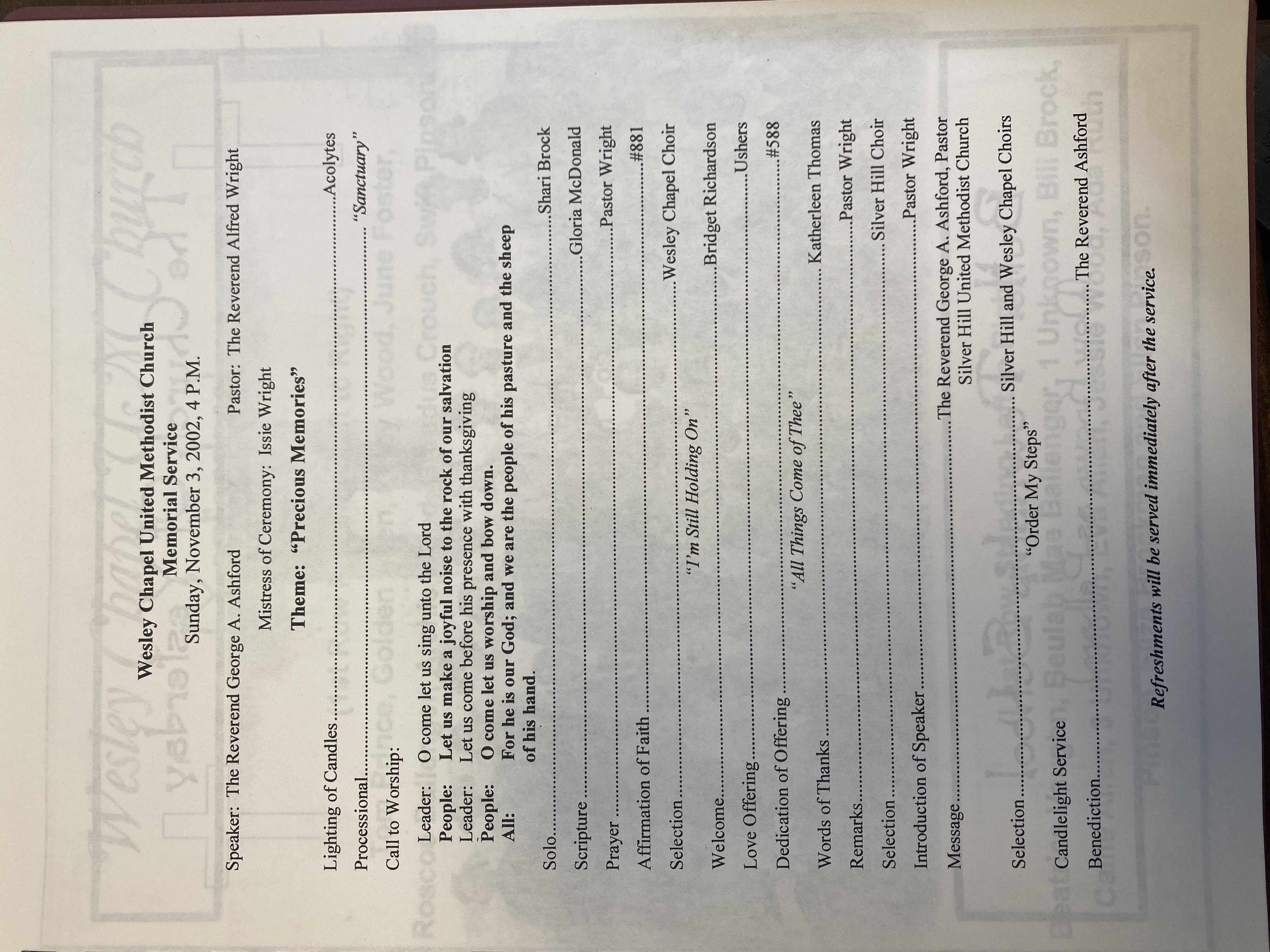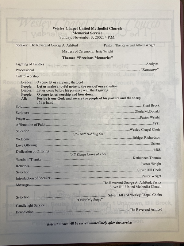 "Memorial Celebration" of Wesley Chapel United Methodist Church on Sunday, November 3, 2002.