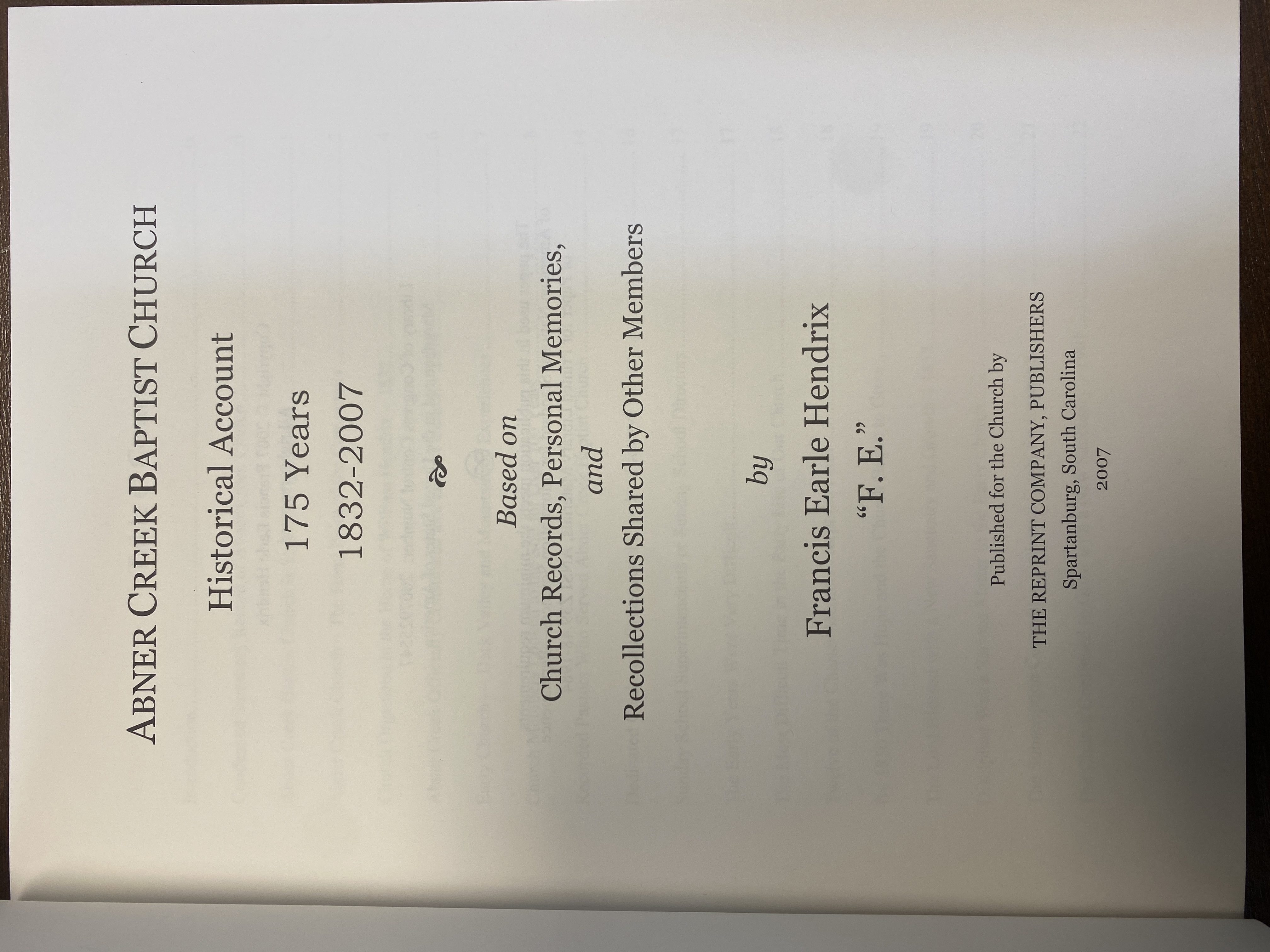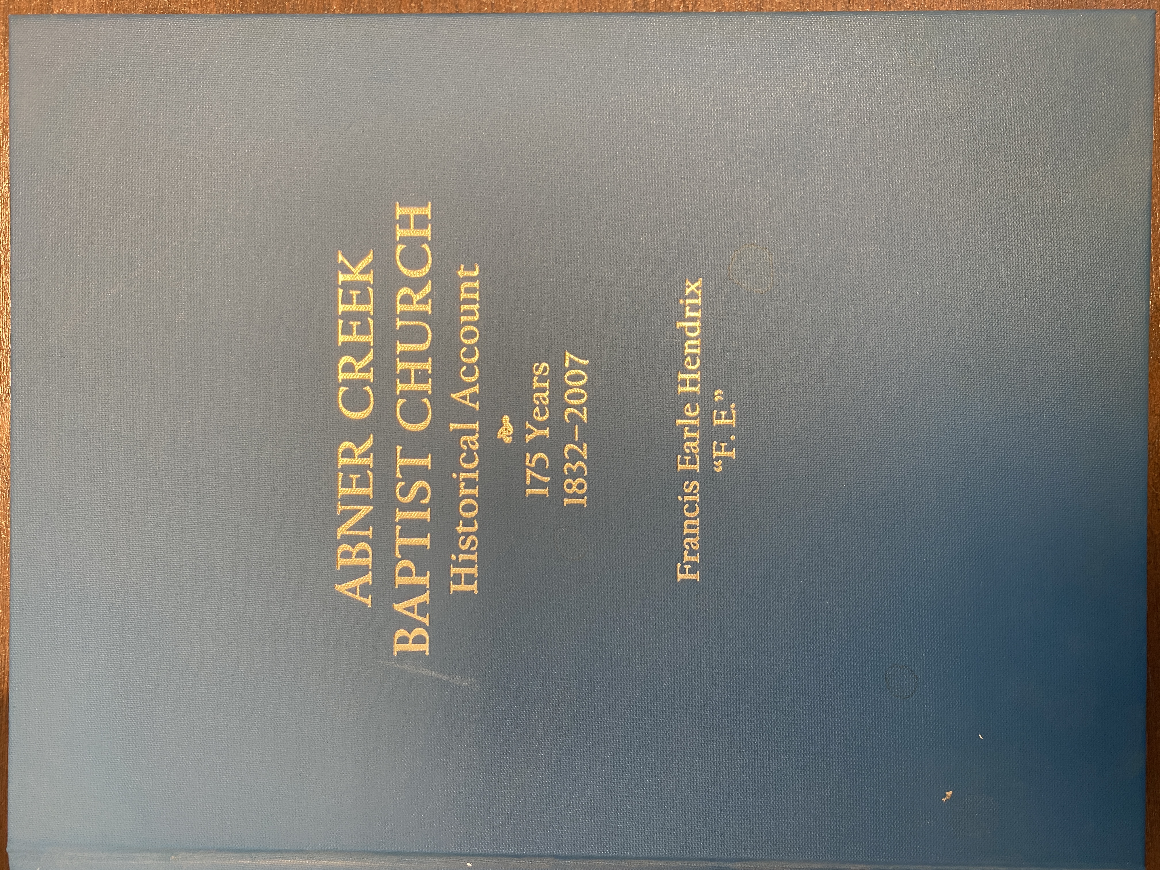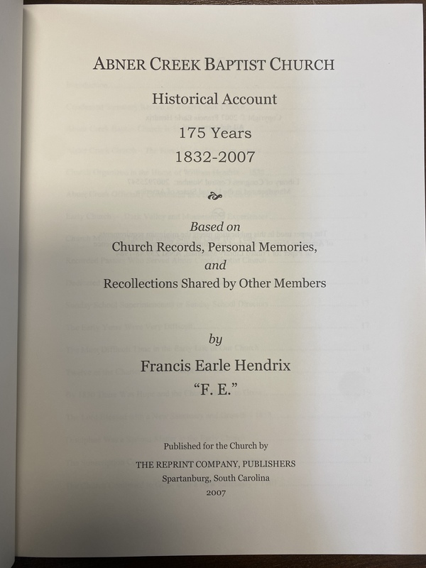 - Abner Creek Baptist Church Historical Account celebrates 175 years of history. It was written by Francis Earle "F.E." Hendrix for the church. The book contains information from Church Records, personal memories, and recollections shared by other members