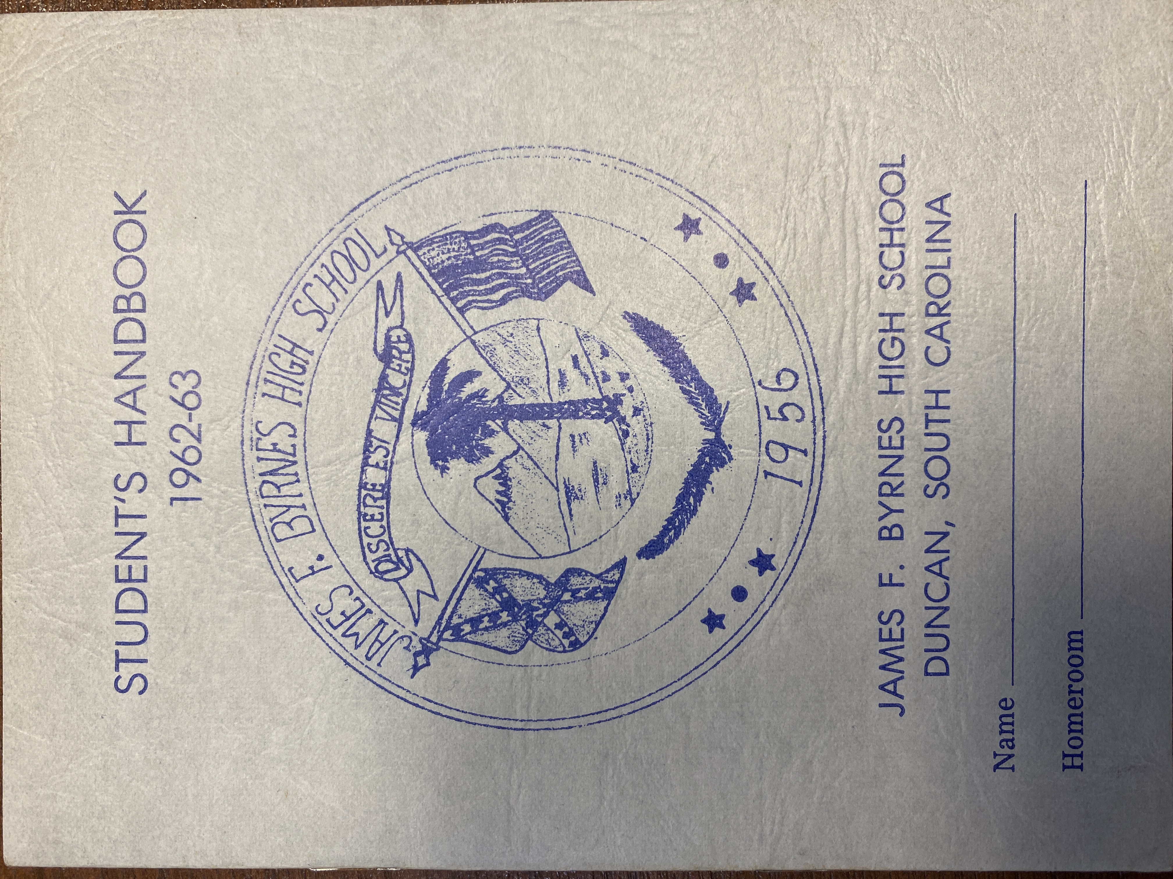This year's handbook has a new school logo of the Schools name with the Confederate Flag and the United States Flag around a Palmetto Tree with the words "Discere Est Vincere" above the tree - Creator