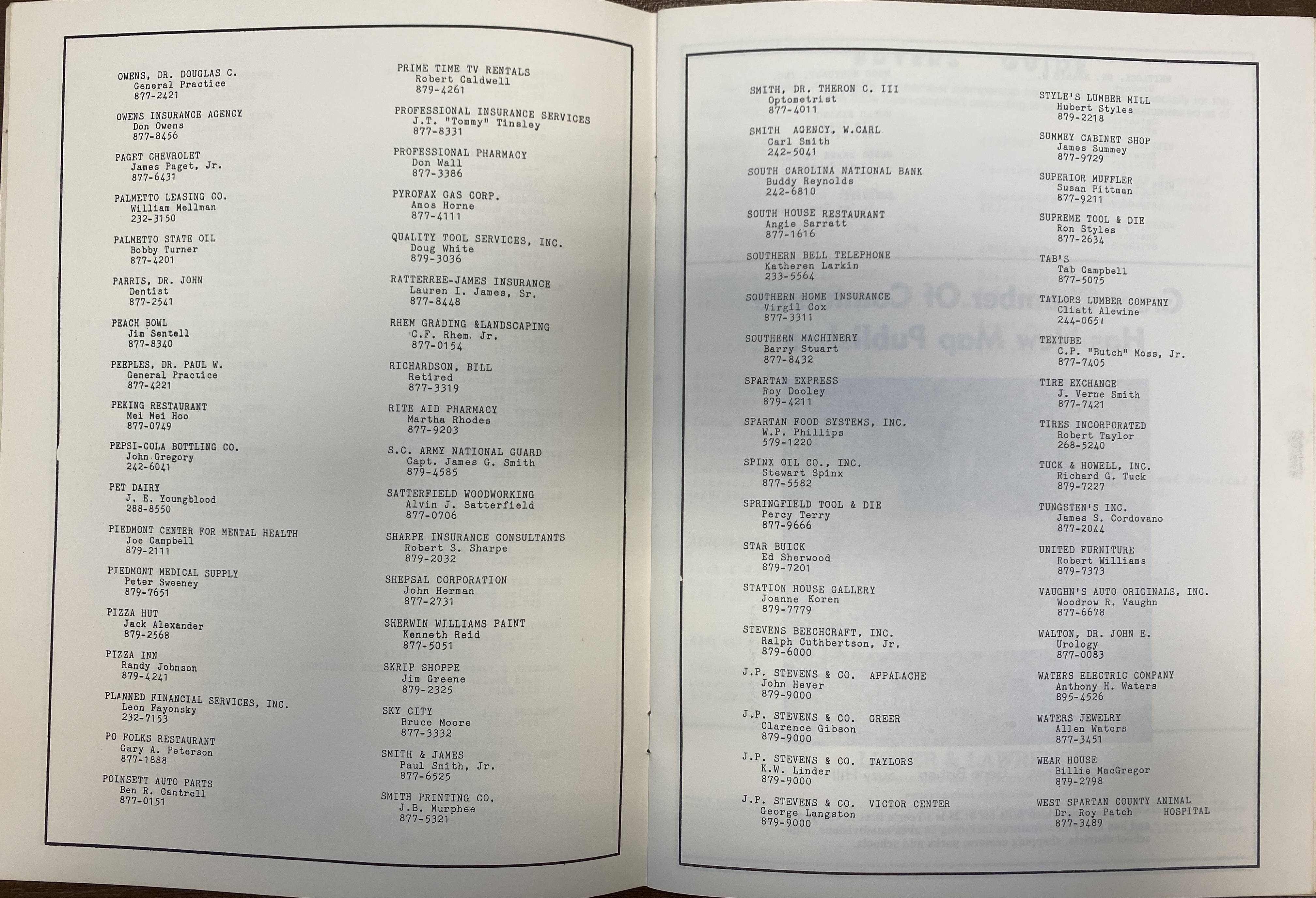 This directory contains information such as the Board of Directors, staff, and reports of the Chamber as well the businesses and churches located in Greer - Creator