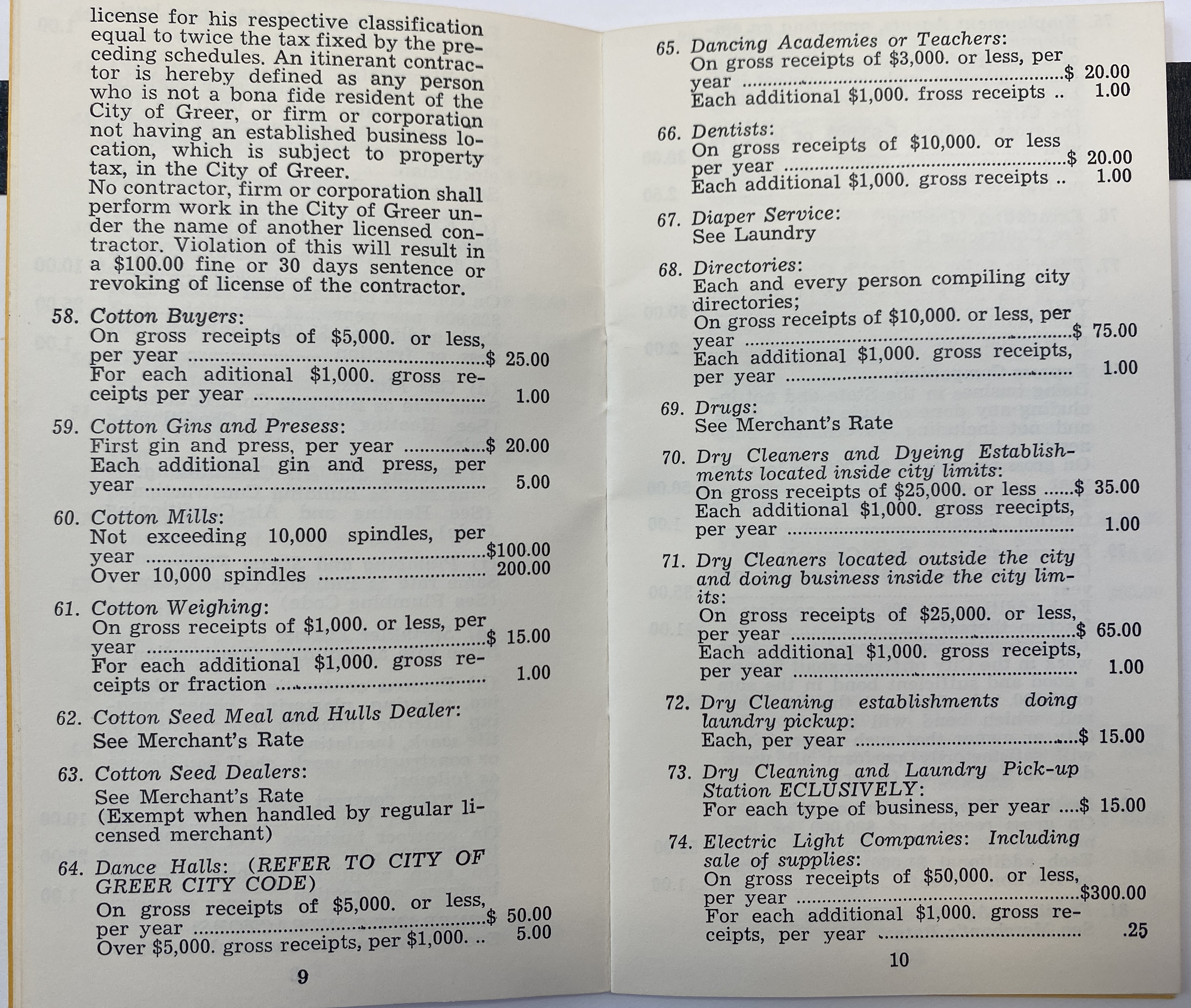 The book contains the different types of businesses and how much it costs to obtain a license in order to operate any business.