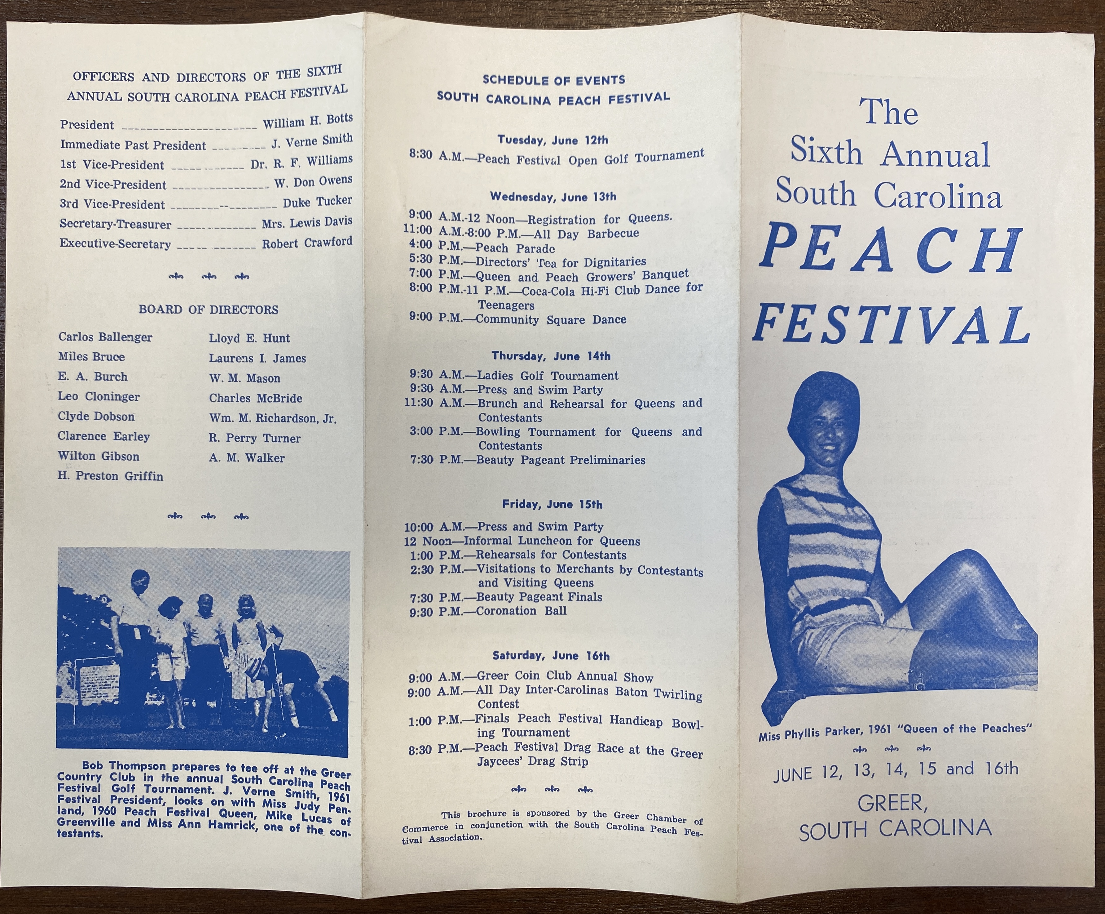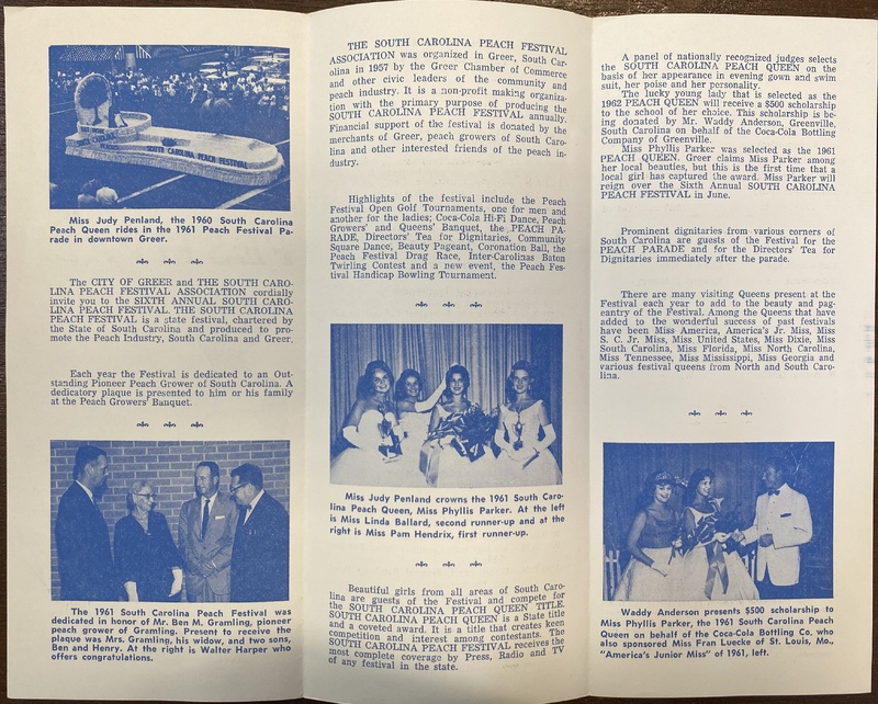 This program contains a history of the festival, current and past Peach Queens, and the schedule of the events for that weekend.