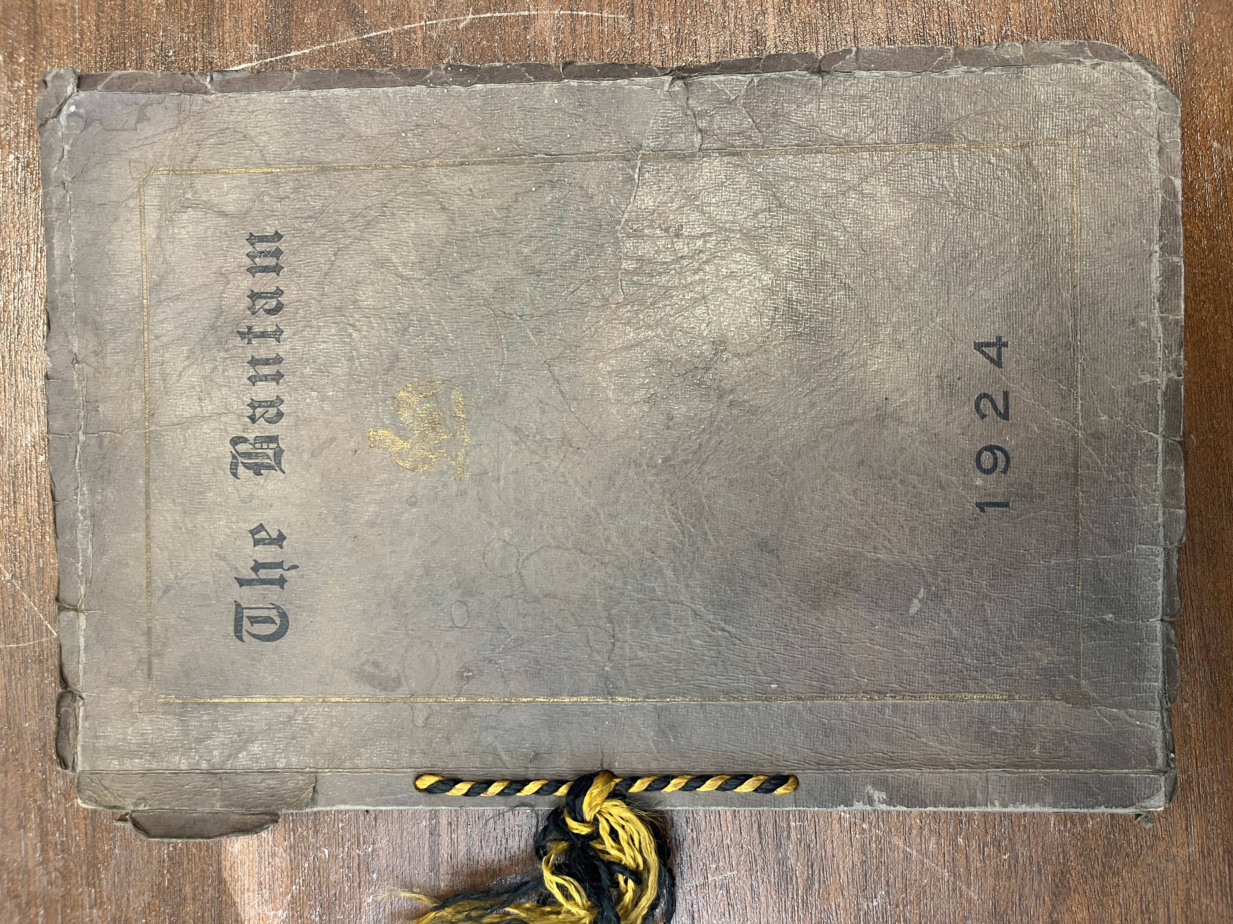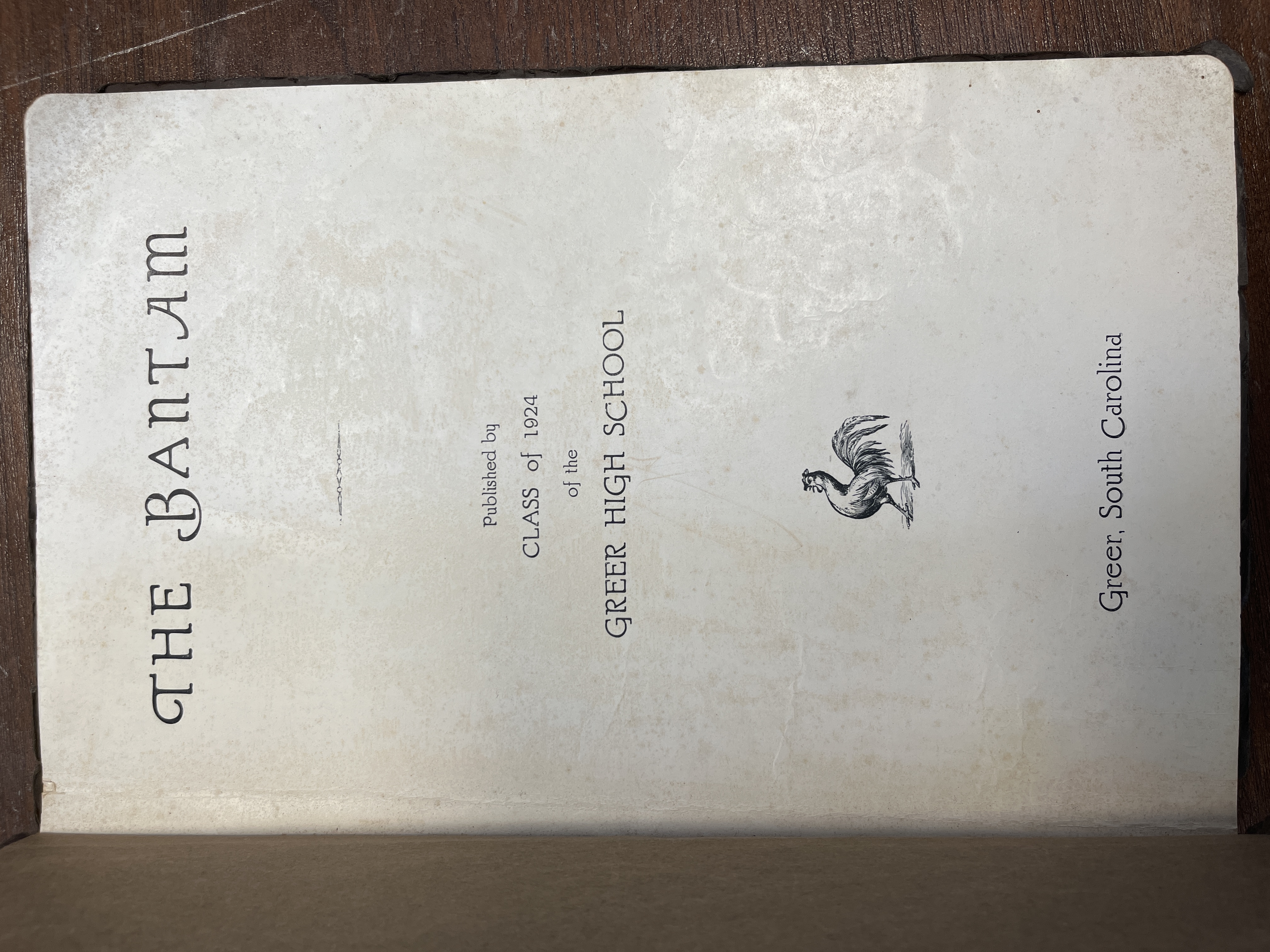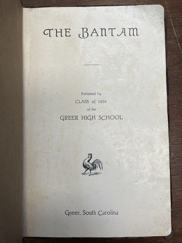 "The Bantam" is the name of the yearbook from Greer High School. This edition is from 1924 and has a brown cover with a gold and black tie binding the book together.