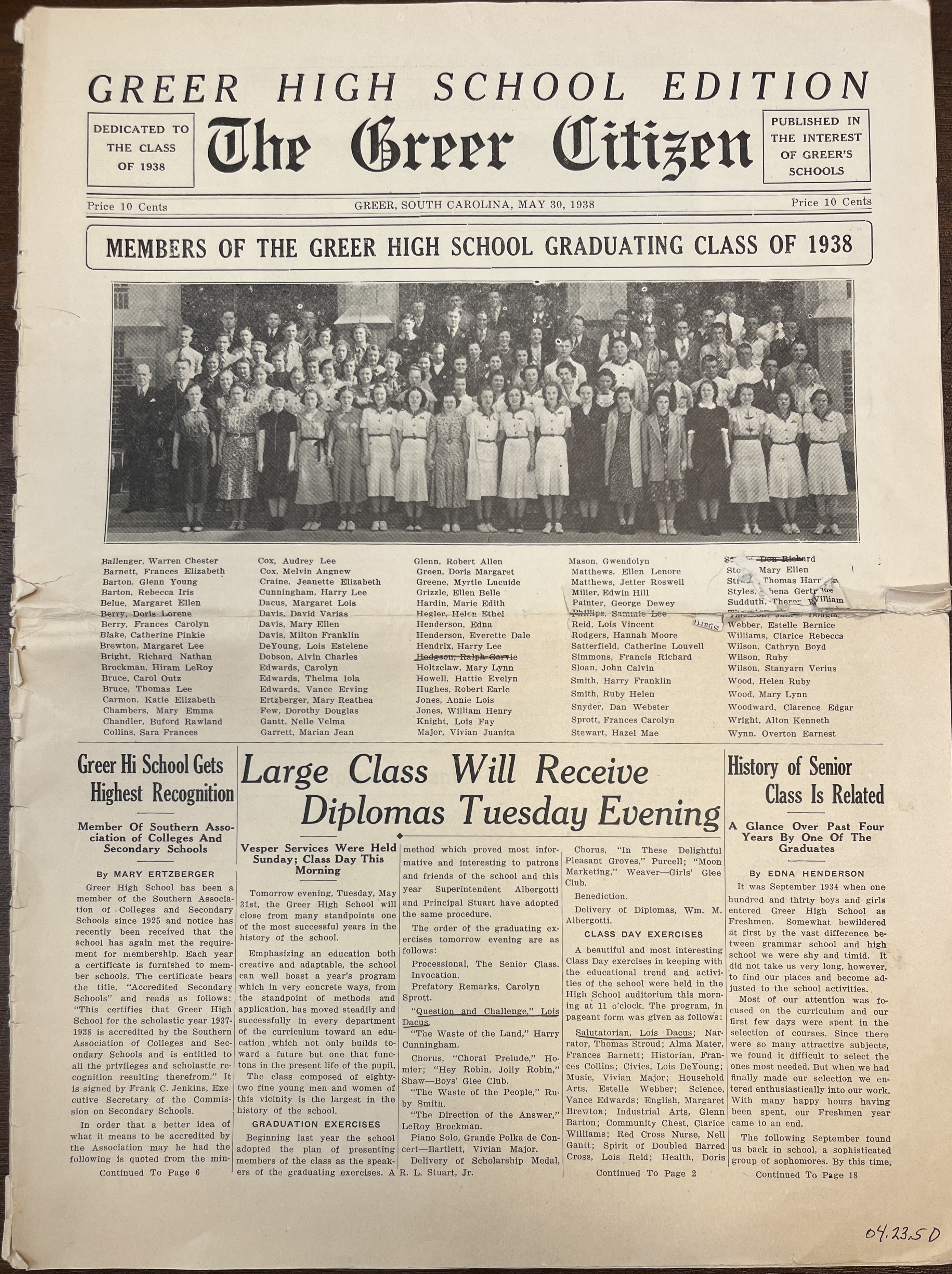 - The Greer Citizen Newspaper Article for the Greer High School Class of 1938