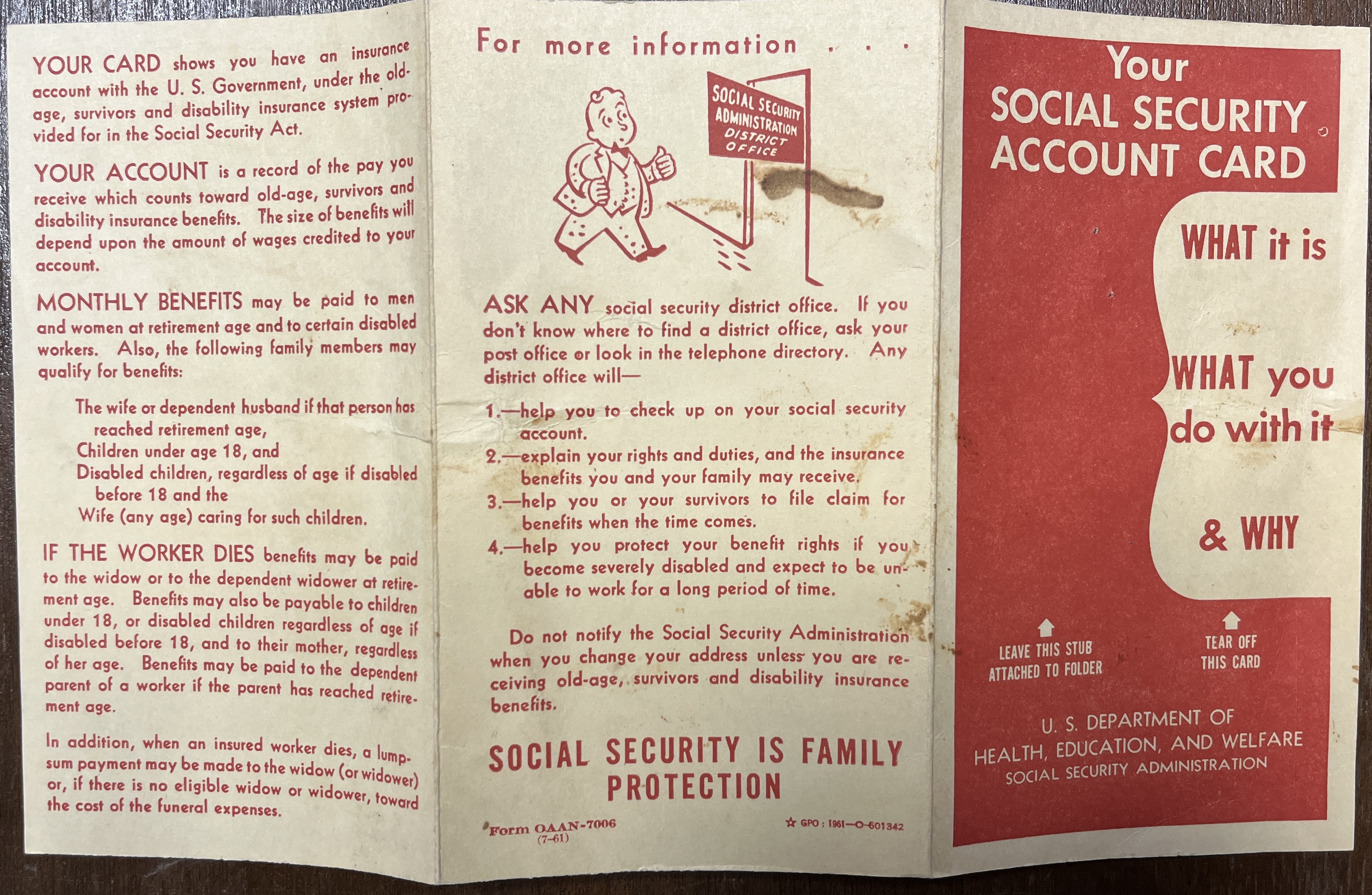 - Your Social Security Account Card Pamphlet was issued by the U.S. Department of Health, Education, and Welfare on the behalf of the Social Security Administration. The pamphlet contains information like how your card works, what to do with your card and why you need your card