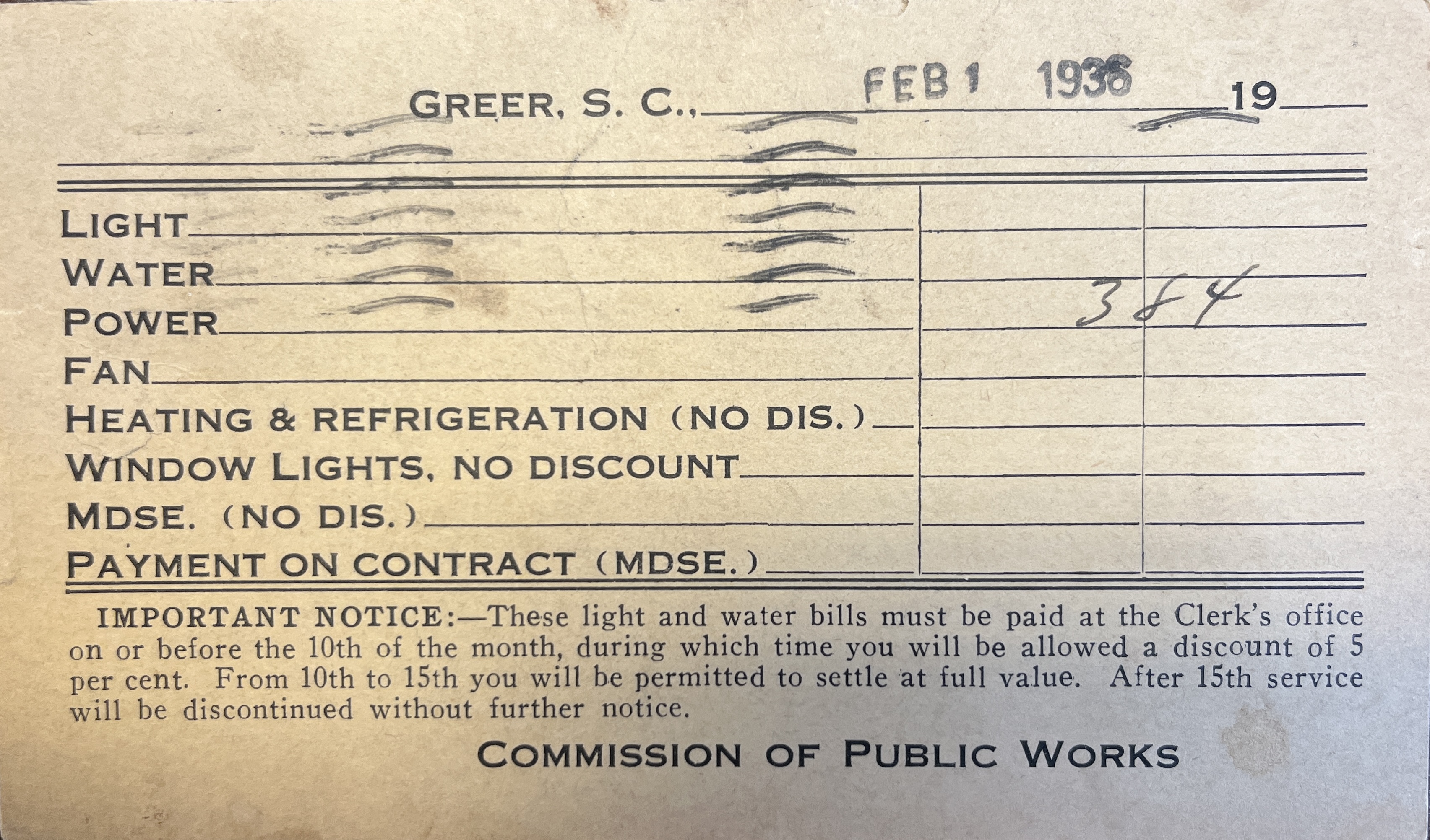 - Mailed Bill from Commission of Public Works dated February 1, 1936, for the amount of 384