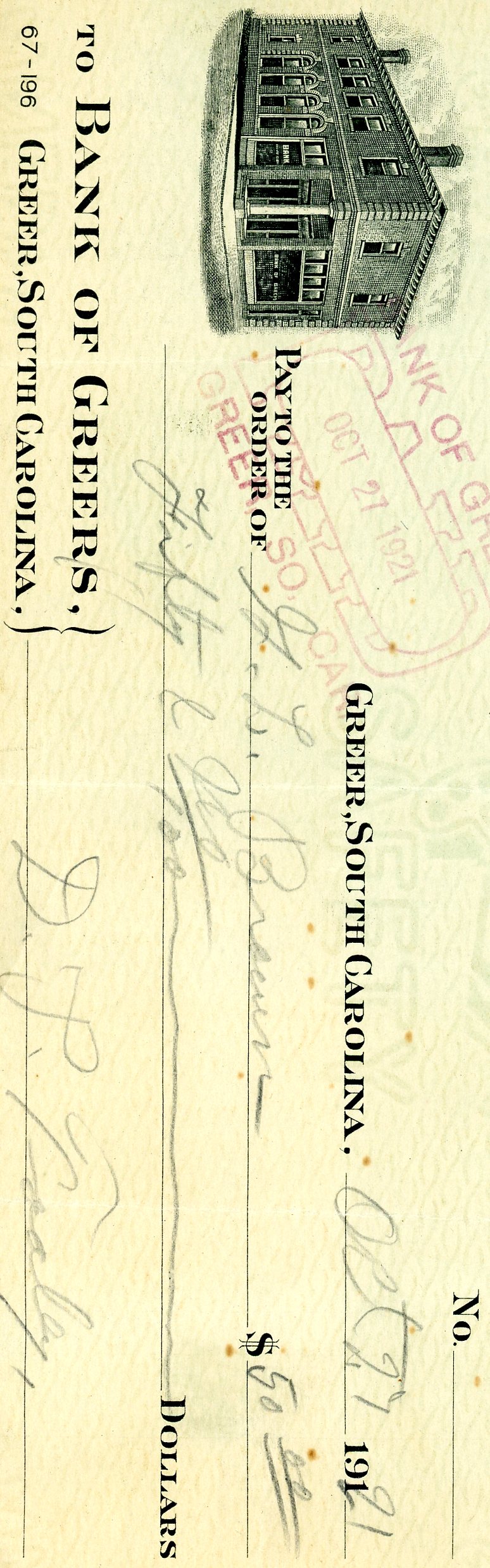 - Cancelled check from Bank of Greer. Pay to the order of G. L. Brown, $50. Written by D. P. Tooley, October 27, 1921.