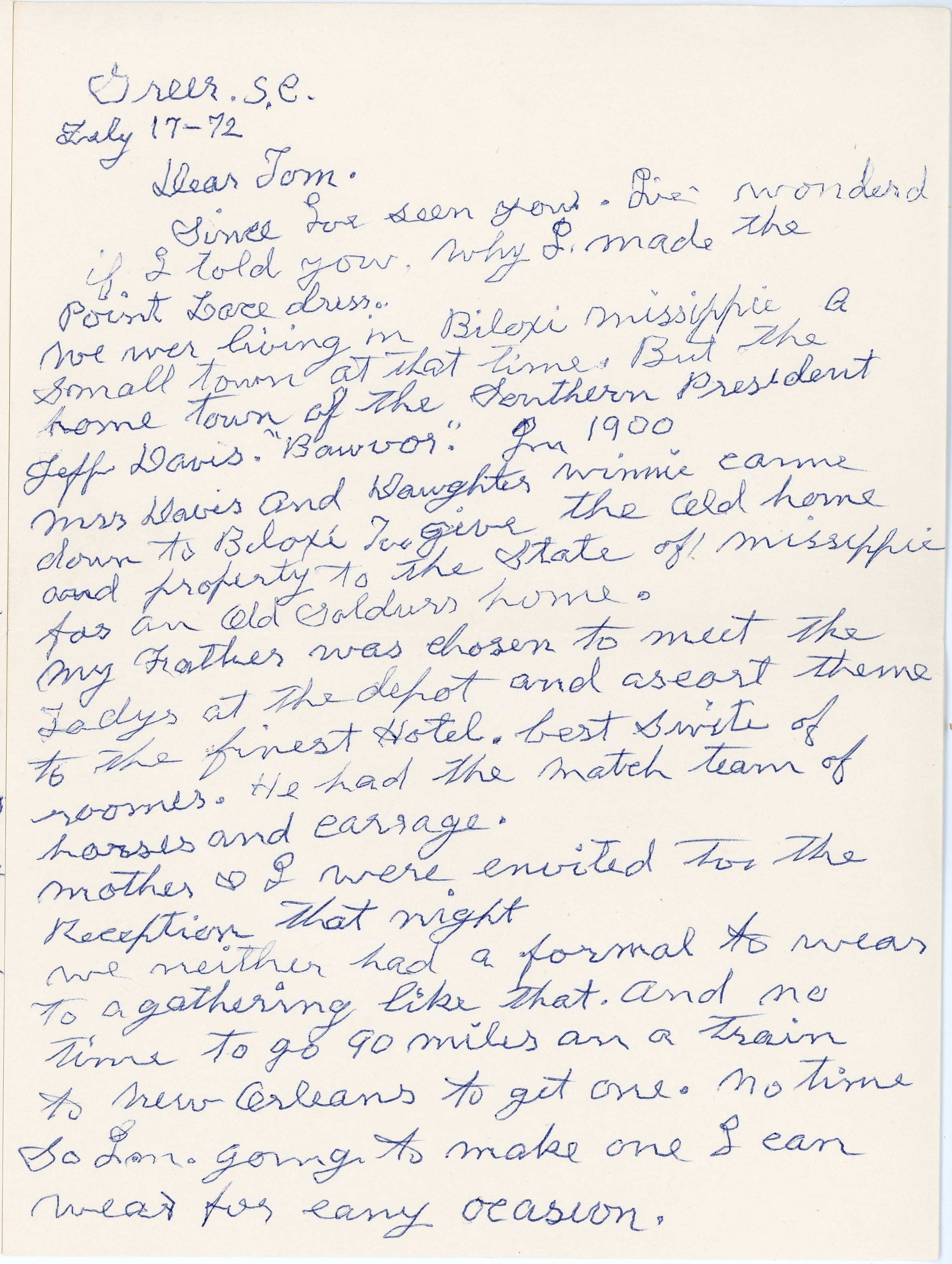 We were living in Biloxi Mississippi a small town at that time. But the home town of the Southern President Jeff Davis, “Bawvor” [Beauvoir]. In 1900 Mrs Davis and Daughter Winnie came down to Biloxi to give the old home and property to the State of Mississippi for an old soldiers home.