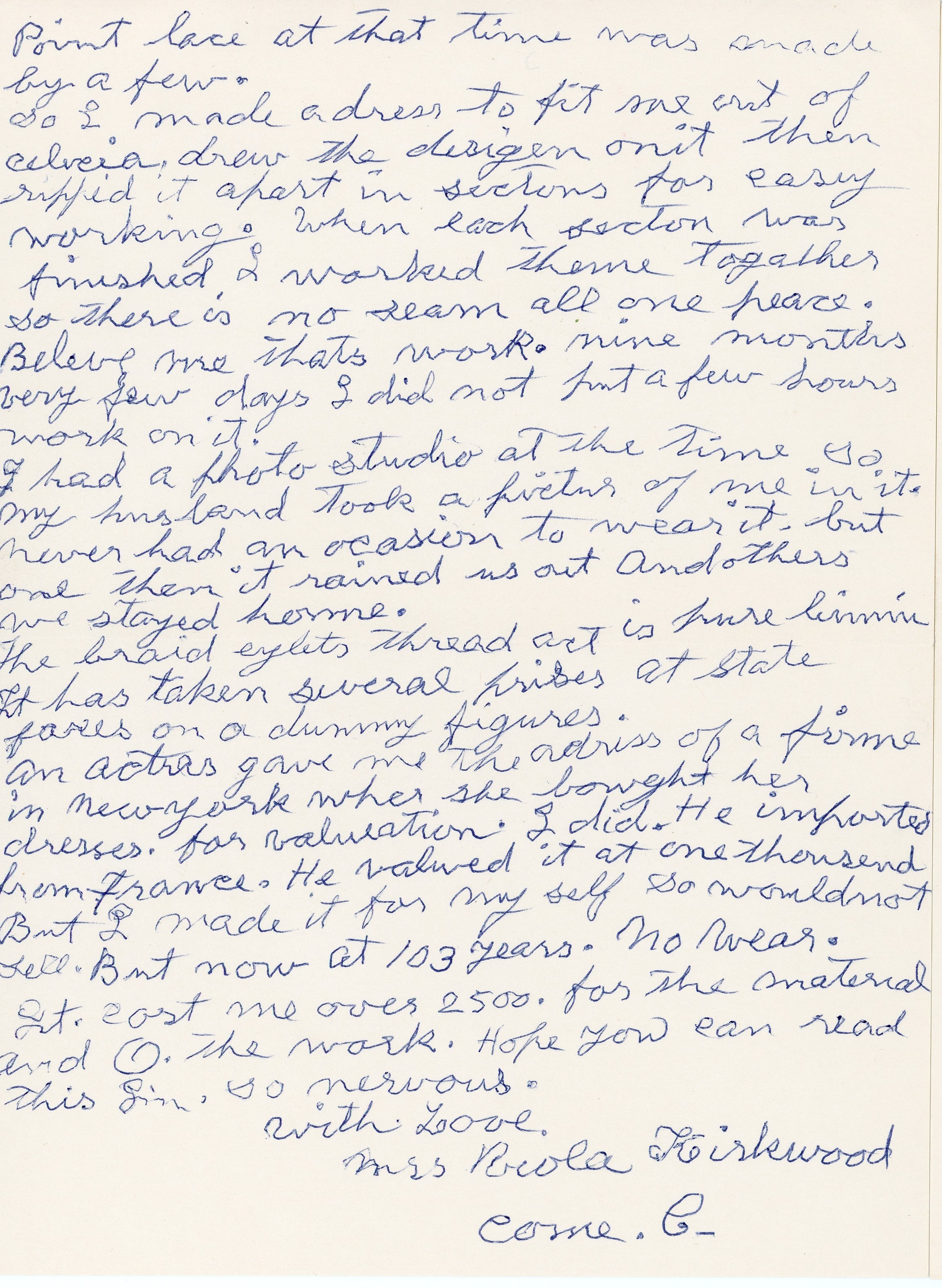 So I made a dress to fit me out of [calico], drew the desigen on it then ripped it apart in sectons for easy working. When each secton was finished I worked them together so there is no seam all one peace. Believe me that’s work. Nine months every few days I did not put a few hours work on it!