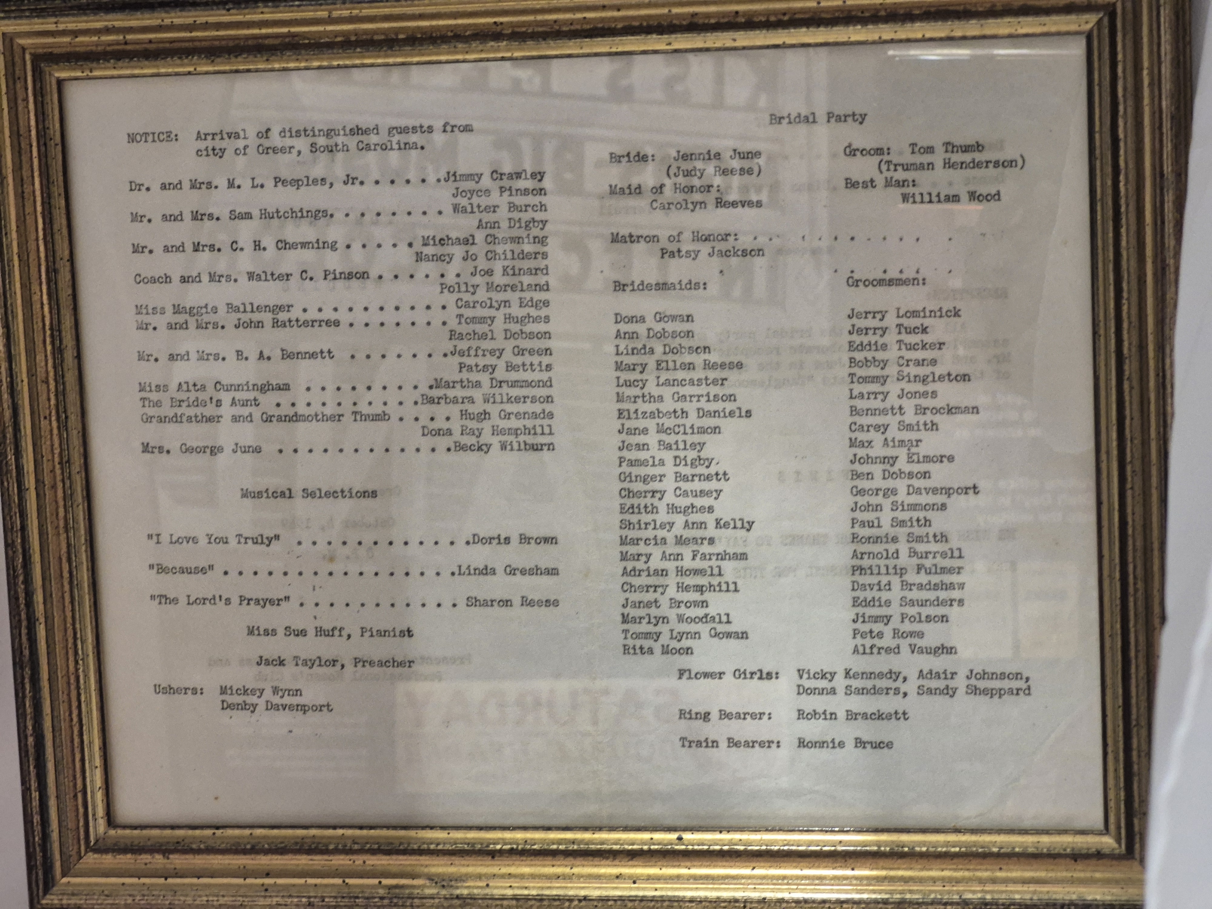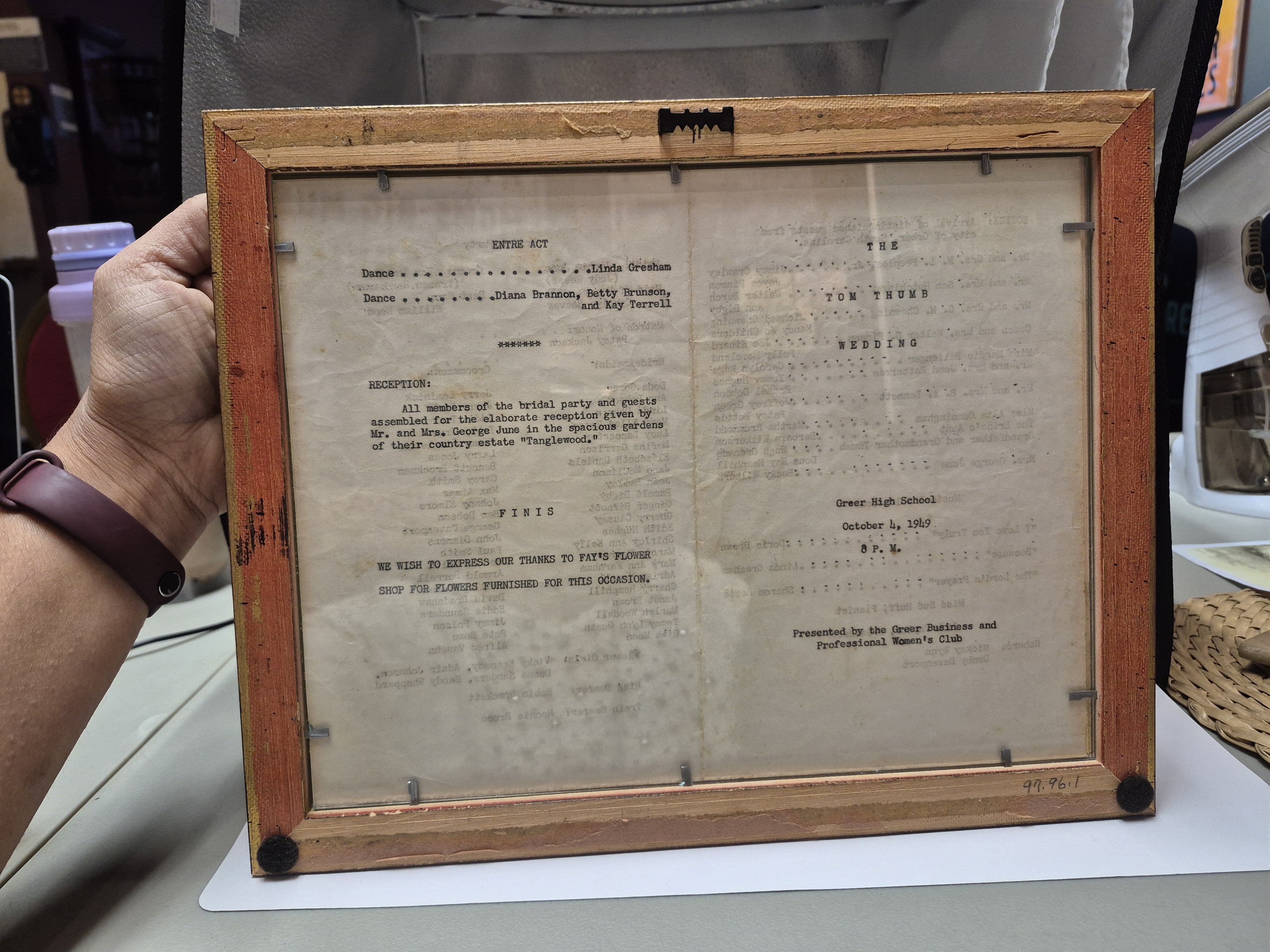 - Framed program of Tom Thumb play that was performed at Greer High School in 1949