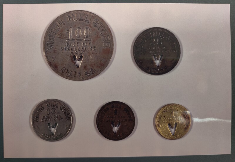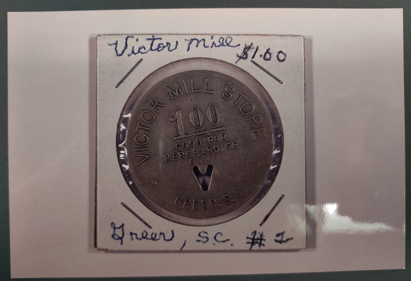Set of 20 pictures-tokens used at Victor Mill Store for employees, Copy of 50 cent pc given for opening account at Bank of Greer, City Park, Presbyterian Church, City Hall, Downtown Greer, Grammar School, First Baptist Church