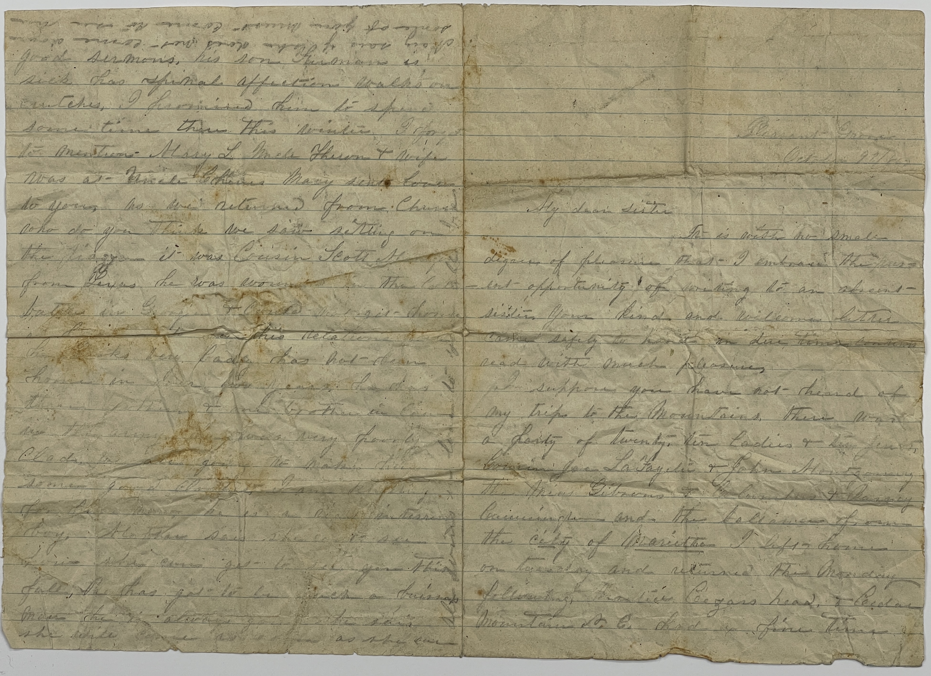We are very busy right now making Jeans I am trying to make me a Cloak but am fearful will not do much at it I saw one the other day it looked nice. There has been a protracted meeting going on at Milford. Pa Mother & Mary went last sunday Alice & myself went to sunday school Pa Mother & I went on tuesday heard a very good sermon from Uncle Landrum you know he never preaches anything but good sermons, his son Furman is sick has spinal affection walks on crutches. I promised him to spend some time there this winter. I forgot to mention – Mary L Uncle Theron & wife was at Uncle Chevis Mary sent love to you, as we returned from Church who do you think we saw sitting on the [buggy?] it was Cousin Scott [Montgomery?] from Texas he was wounded in the [late?] battles in [Georgia?] & [illegible] not get [illegible] at [illegible, several words] his relations [illegible] he looks very badly has not been home in over [four?] years. He has [this? Illegible] & one brother in law in the army [illegible] very poorly [Clad?] we are going to make [him?] some [illegible phrase] I am [hoping?] for [illegible] he is a [illegible phrase] boy. [ illegible sentence or two ] she can get to see you this fall, Pa has got to be such a [business man?] he is always [illegible phrase]