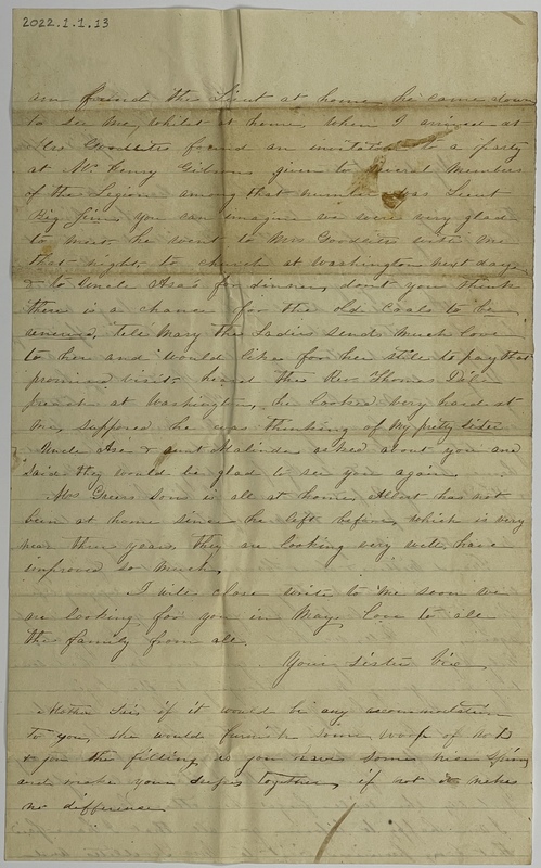 I am happy to inform you all that I have paid that long promised visit to Mrs Goodletts and am found the Lieut at home he came down to see me whilst at home, when I arrived at Mrs Goodletts found an invitation to a party at [Mr?] Henry Gibsons given to several members of the Legion among that number was Lieut Big Jim. you can imagine we were very glad to meet. He went to Mrs Goodletts with me that night, to church at Washington next day, & to Uncle Asa’s for dinner, dont you think there is a chance for the old coals to be renewed. Tell Mary the Ladies send much love to her and would like for her still to pay that promised visit. Heard the Rev Thomas Dile[?] preach at Washington. He looked very hard me. Supposed he was thinking of my pretty sister