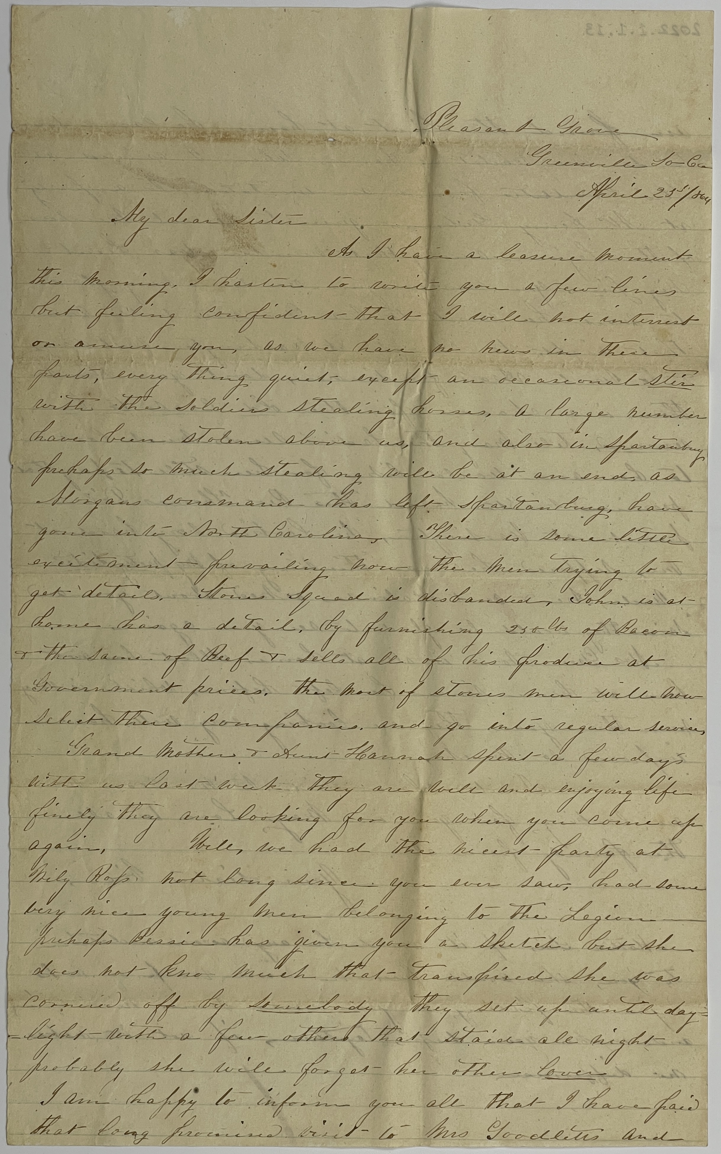 As I have a leasure moment this morning I hasten to write you a few lines but feeling confident that I will not interrest or amuse you, as we have no news in these parts, every thing quiet, except an occasional stir with the soldiers stealing horses. A large number have been stolen above us, and also in Spartanburg perhaps so much stealing will be at an end as Morgans command has left Spartanburg, have gone into North Carolina. There is some little excitement prevailing now the men trying get details. Stones squad is disbanded, John is at home has a detail. By furnishing 250 lbs of Bacon and the same of Beef & sells all of his produce at Government prices. The most of stones men will now select there companies. and go into regular service.