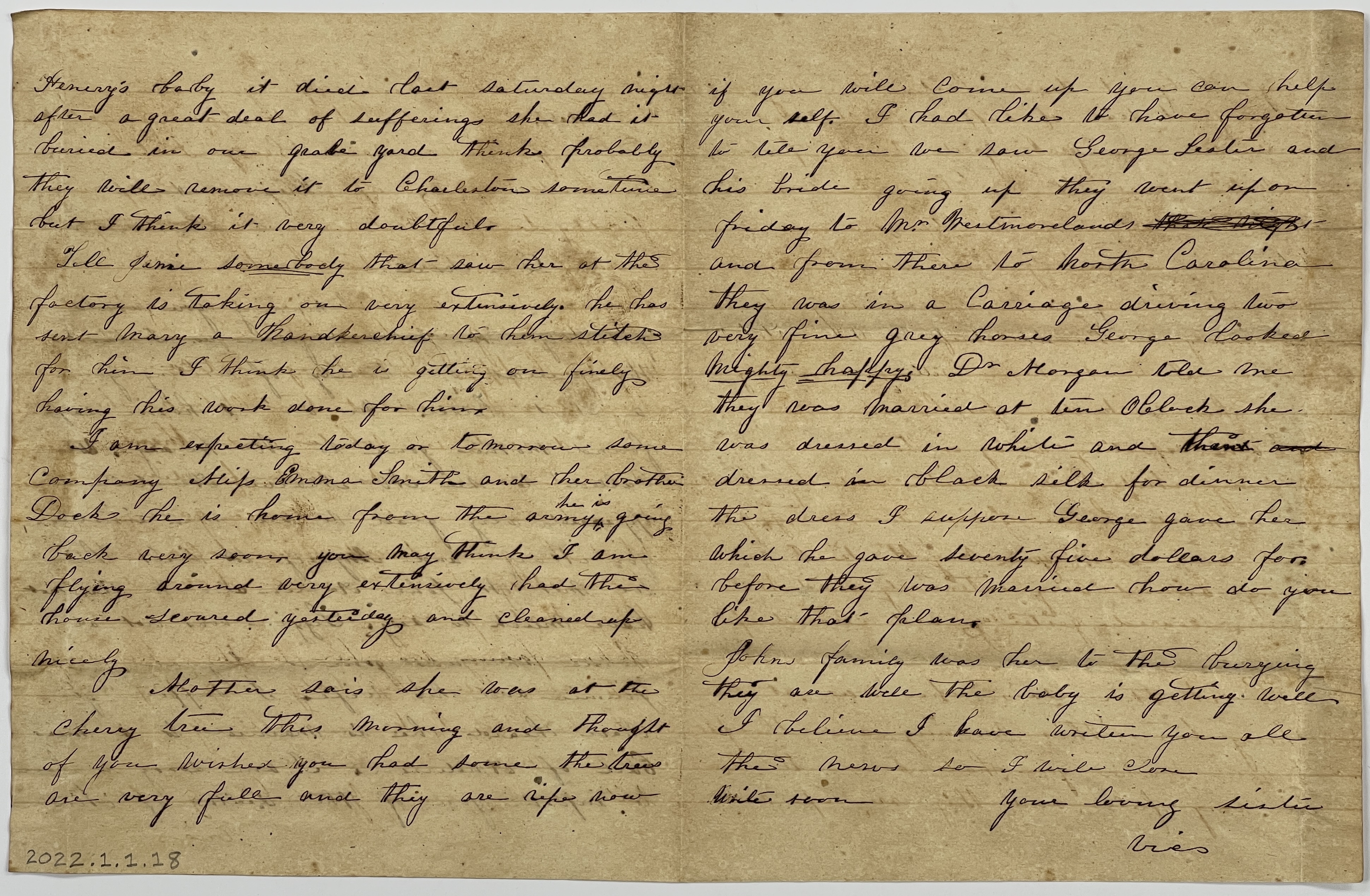 Thinking you would probably like to hear from us. I take the present opportunity of writing you a short letter. We arrived home safe found Mother’s gone to Mr. Henrys. We called to see Mrs. Mattie Austin she appeared very glad to see me insistive for Mary and Myself to isi her we met Mr John Austin also he dise not have much to say. Lizzie was not at home she was gone to Augusta with Jimmie and his wife. I suppose you have heard he is married to a Miss Earl of Anderson. I am sorry to have to inform you of the death of Mrs Henry’s baby it died last Saturday night after a great deal of suffering she had it buried in our grave yard thinks probably they will remove it to Charleston sometime but I think it very doubtful.