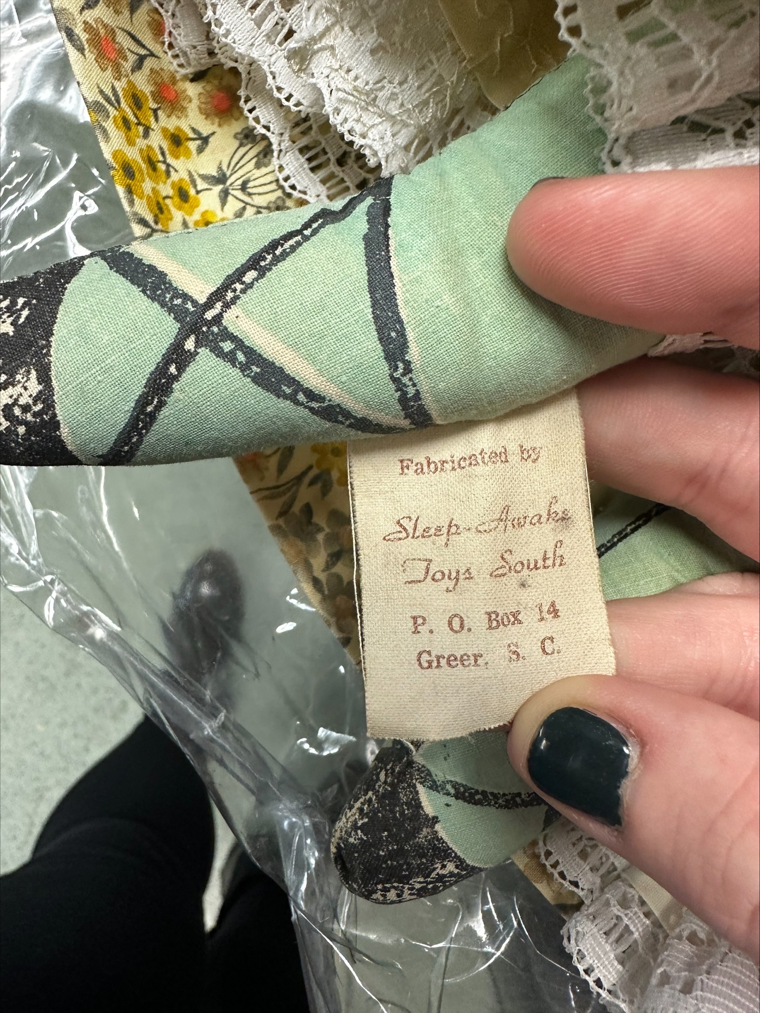 Sleep-Awake was in business in Greer during the 1960s. Several of their products were modeled after 1800s dolls in the Museum of the City of New York; and the dolls sold mostly to adults as nostalgia products. The company was named after a doll style popular in the 1800s: a “sleep awake” doll had a two-sided head with an “awake” face on one side and an “asleep” face on the other. Another version was usually a girl in a dress. The doll had a secret: the dress could be flipped to the opposite end, revealing not legs but a second second torso and head of the same person, but with eyes closed, asleep. These were also called topsy-turvy dolls.
