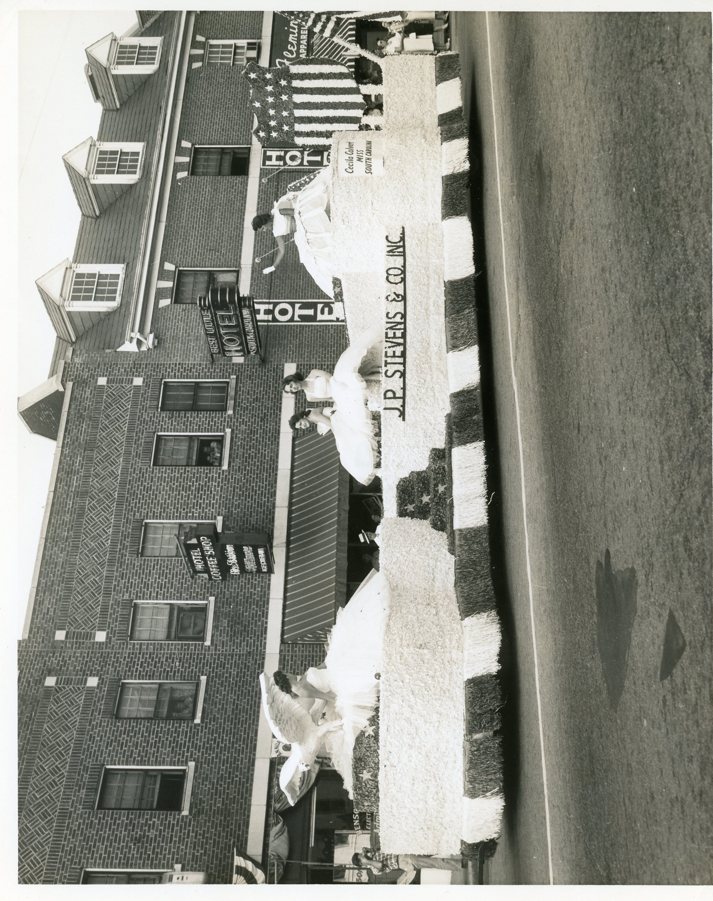 - J. P. Stevens & Co. Inc. Peach Festival parade float with Cecila Colvert, Miss South Carolina, and four other women. Photographed by Joe F. Jordan.