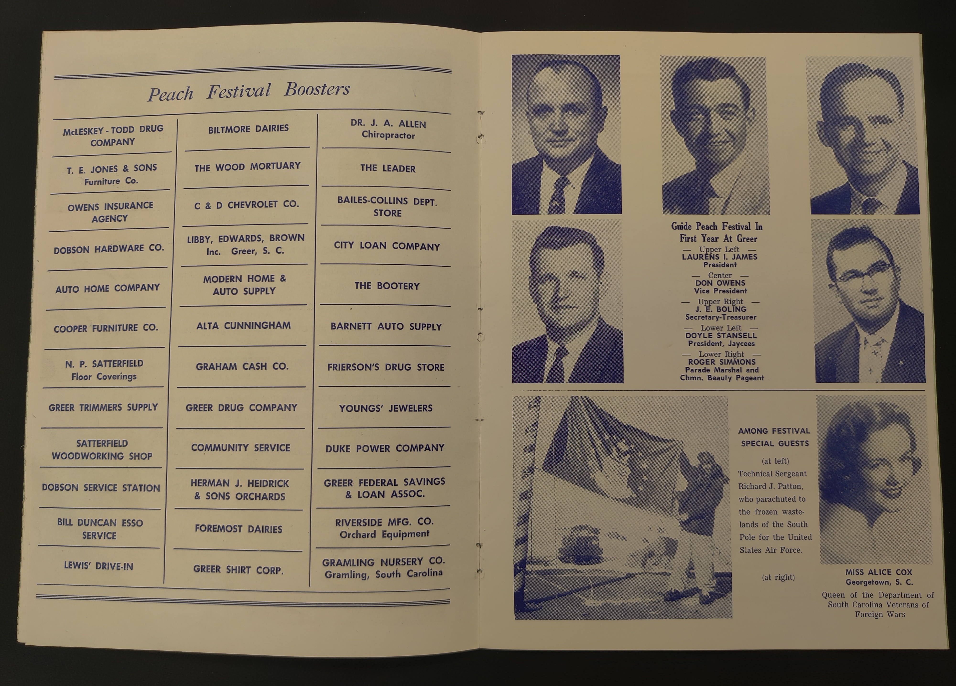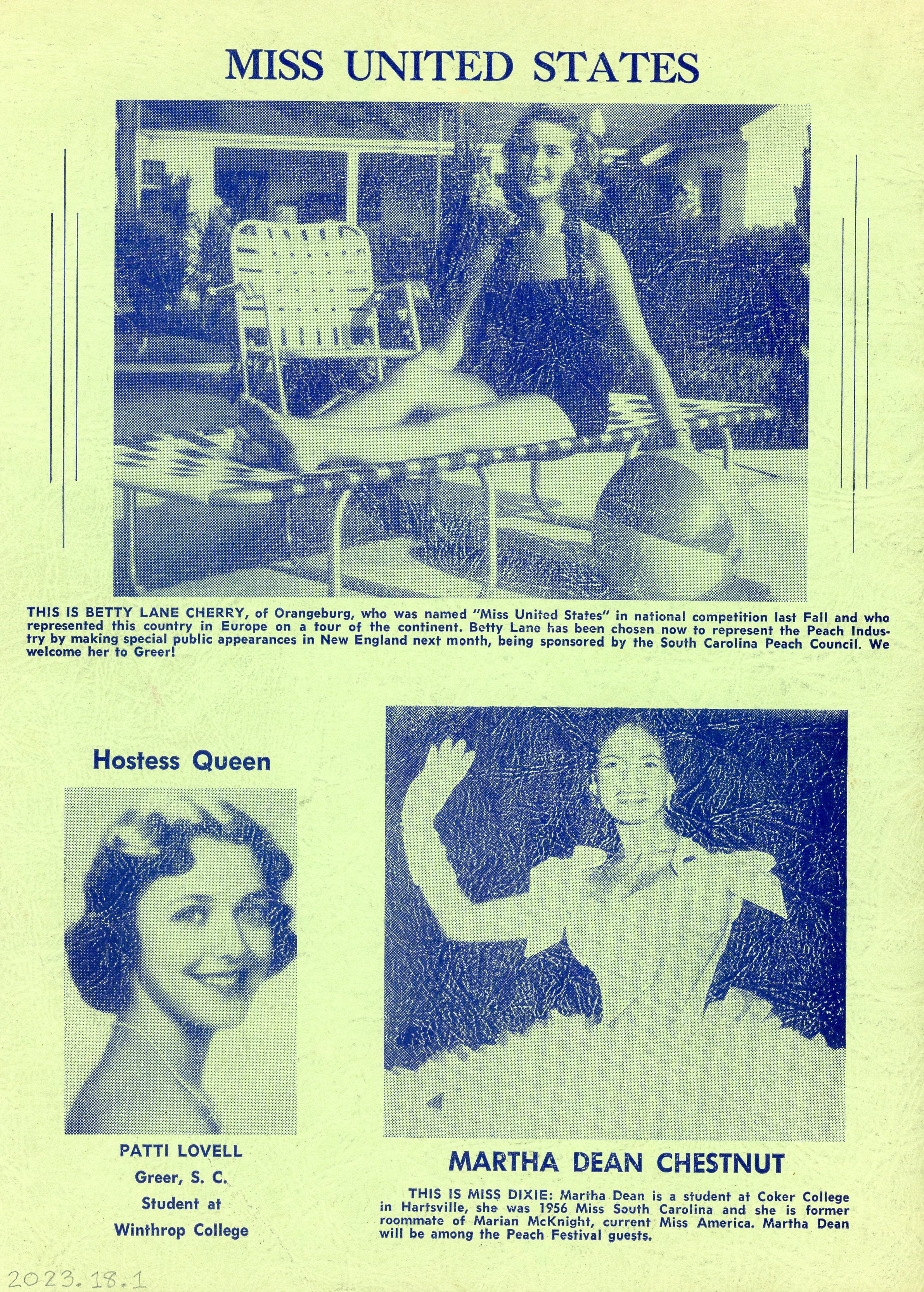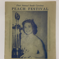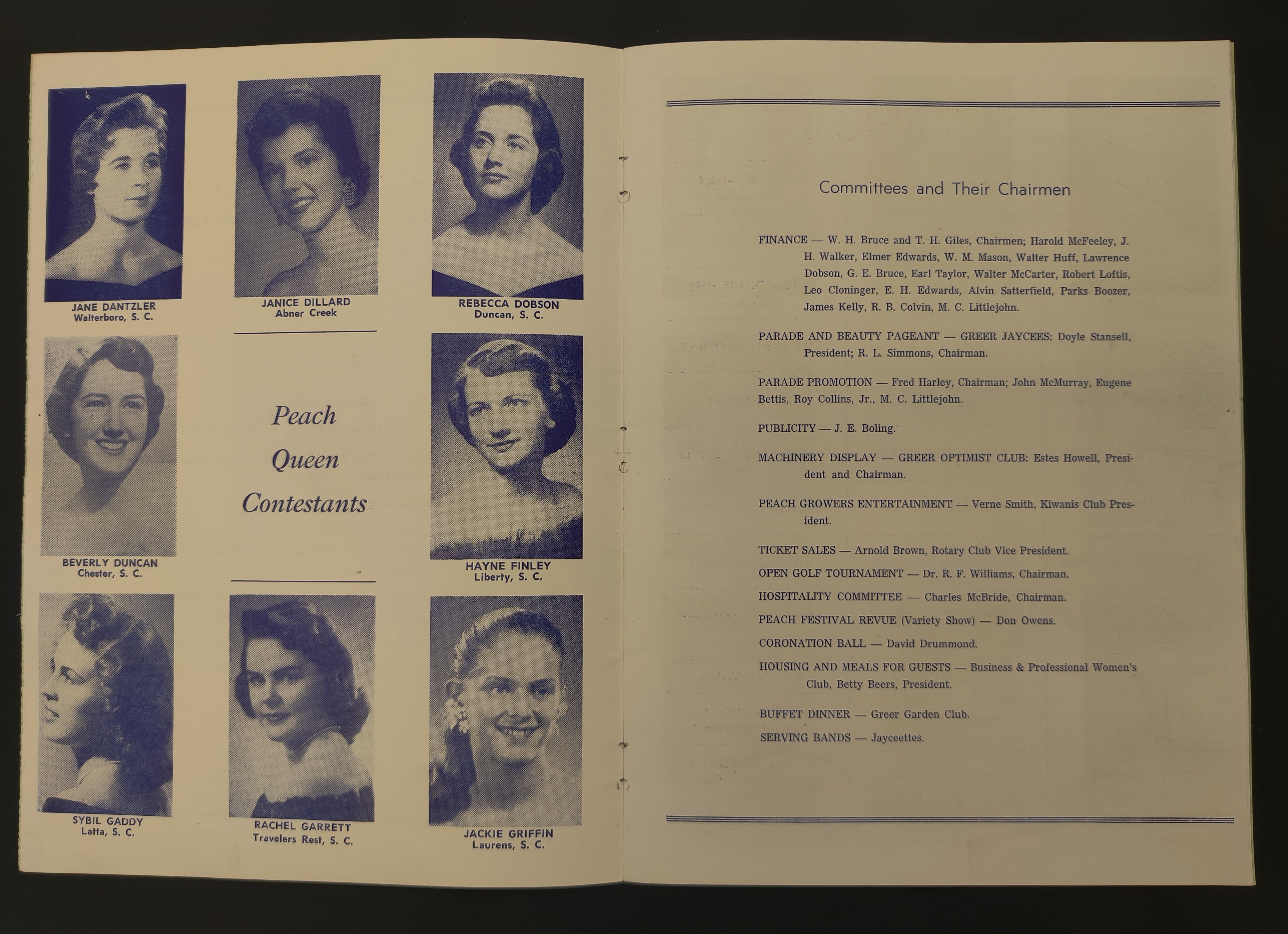 - A program for the 1957 Peach Festival including photographs of Peach Queens contestants, lists of committees and boosters, a festival itinerary, and festival purpose statement (1996.36.1 duplicate)