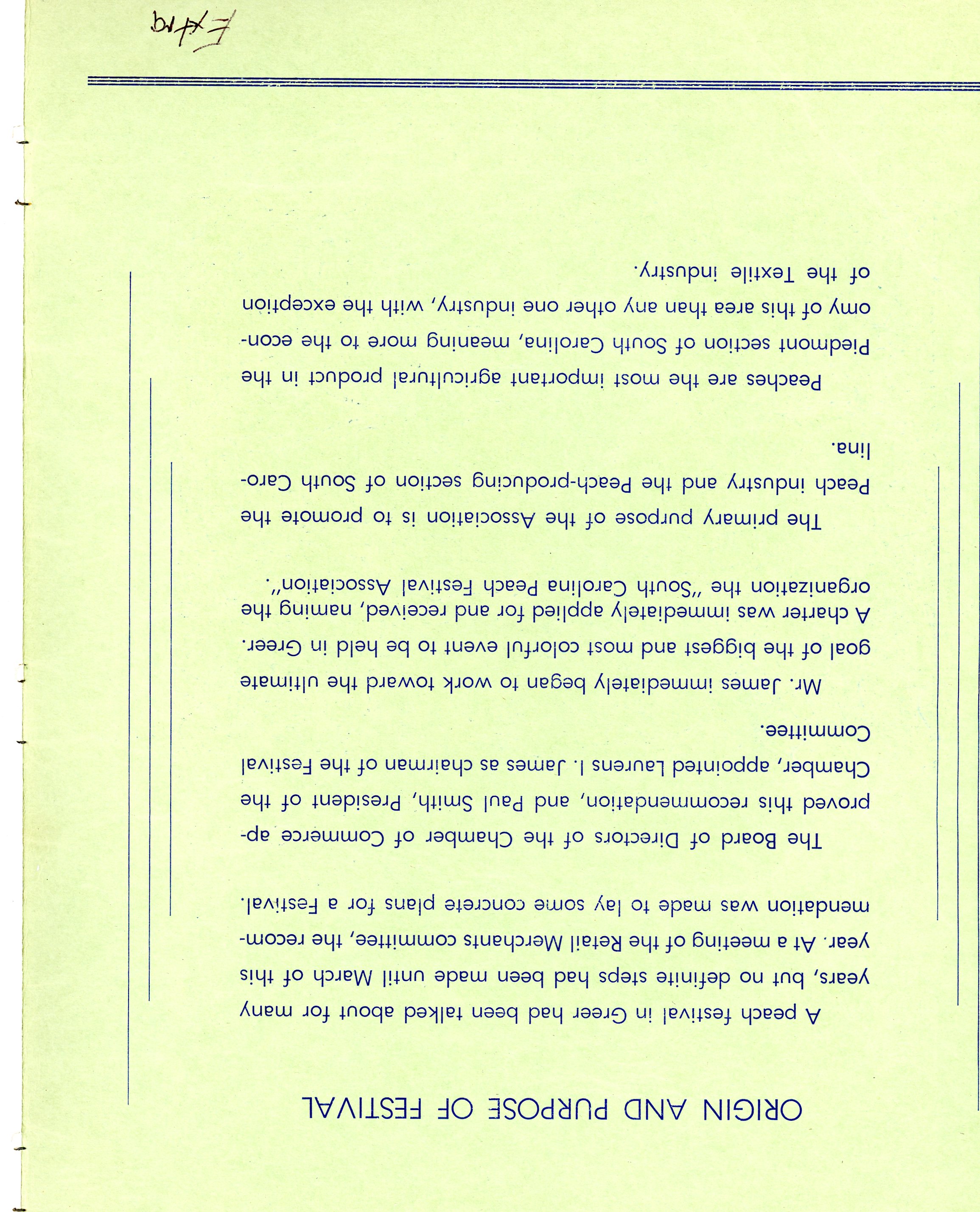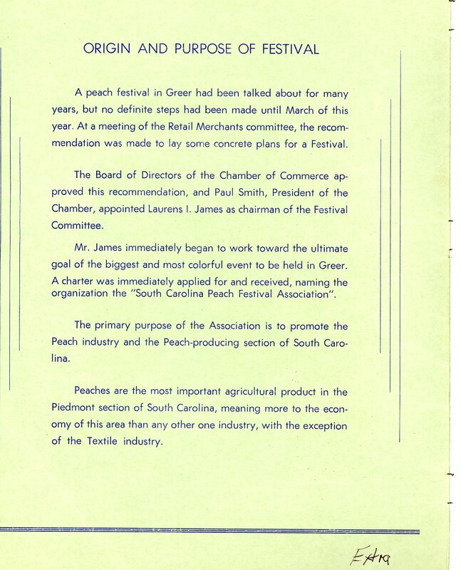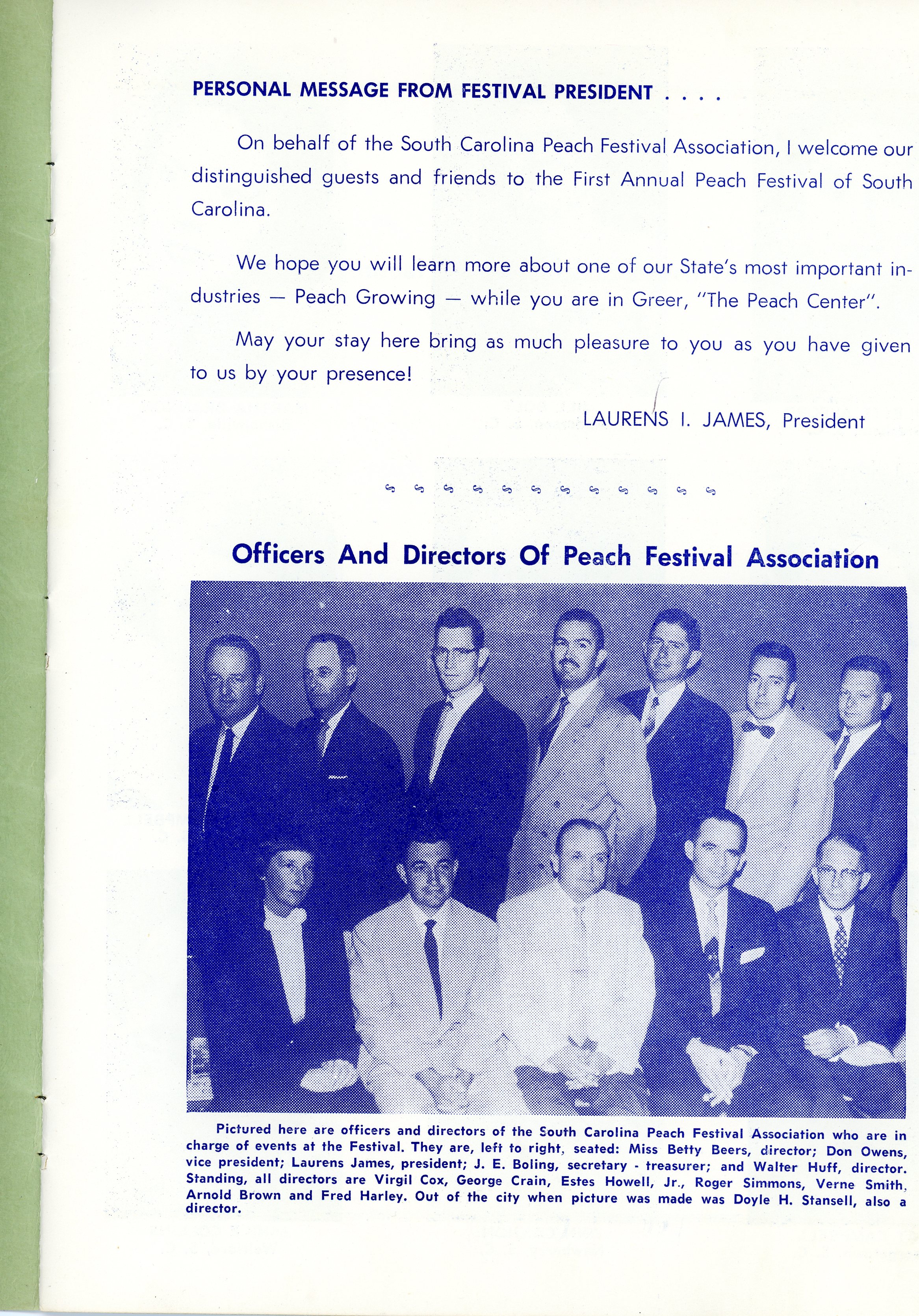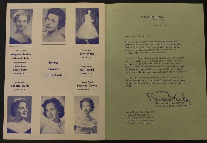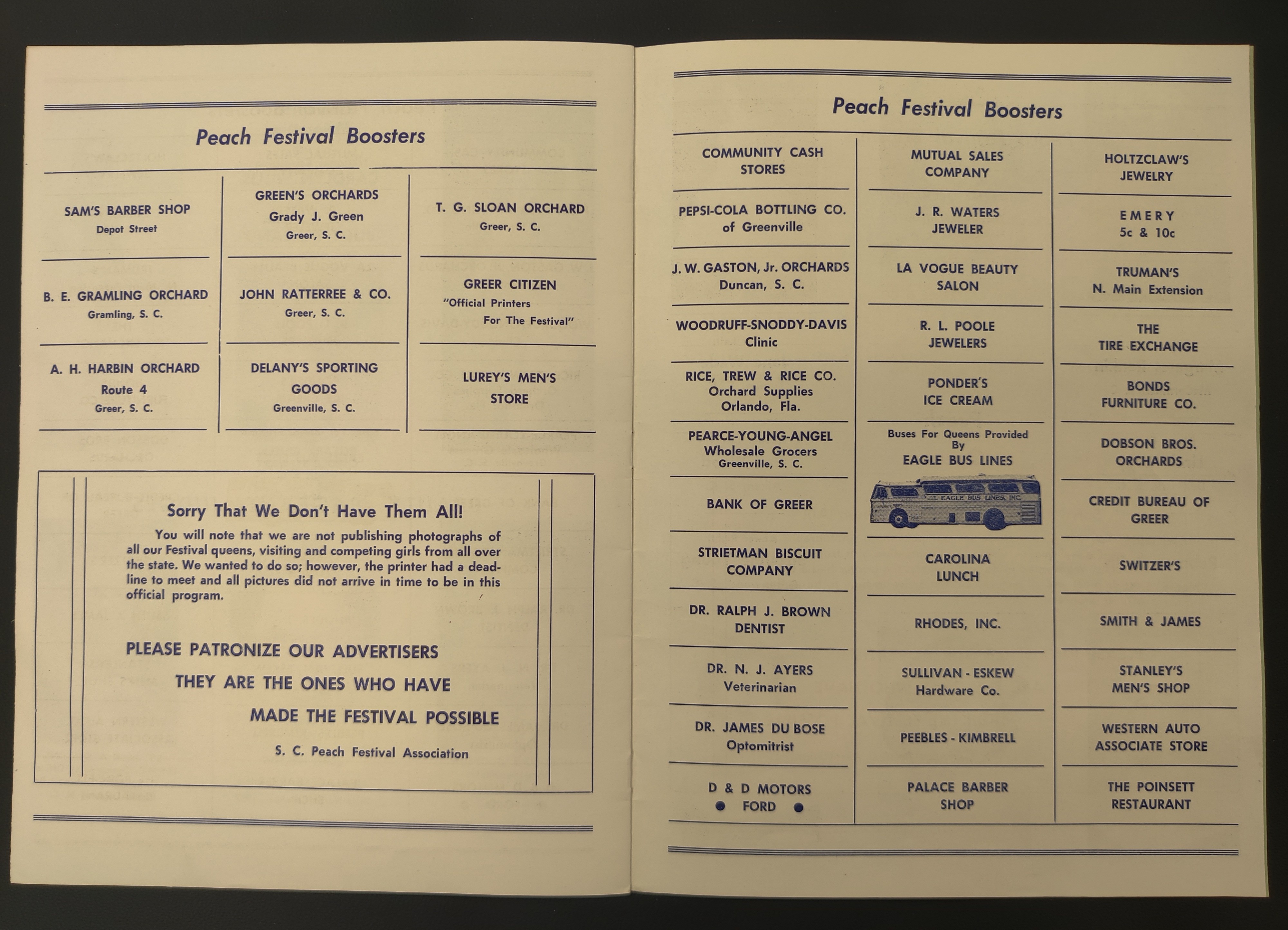 - A program for the 1957 Peach Festival including photographs of Peach Queens contestants, lists of committees and boosters, a festival itinerary, and festival purpose statement (1996.36.1 duplicate)