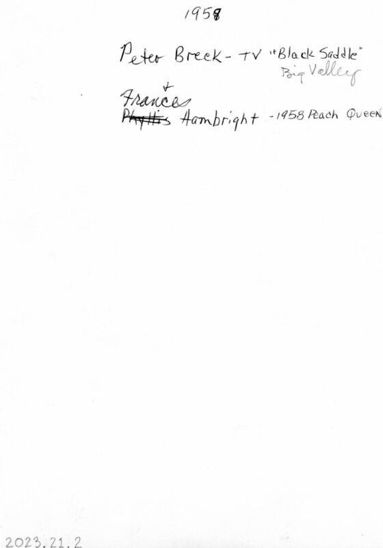 - Photograph: 1959 Peach Festival judge Peter Breck with 1958 queen Frances Hambright