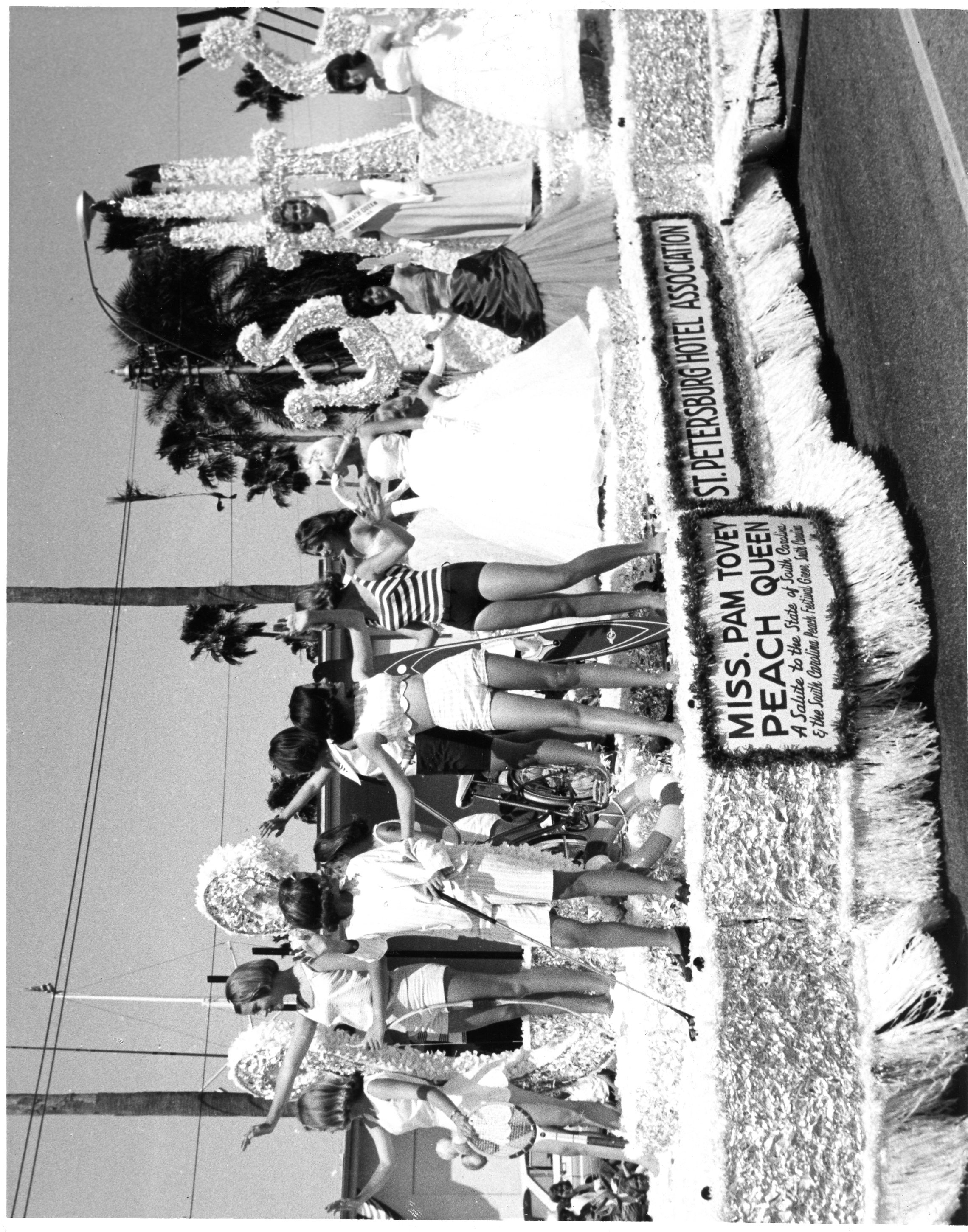 - Photograph of Peach Queen Pam Tovey on St. Petersburg Hotel Association float at the Festival of States in St. Petersburg, Florida