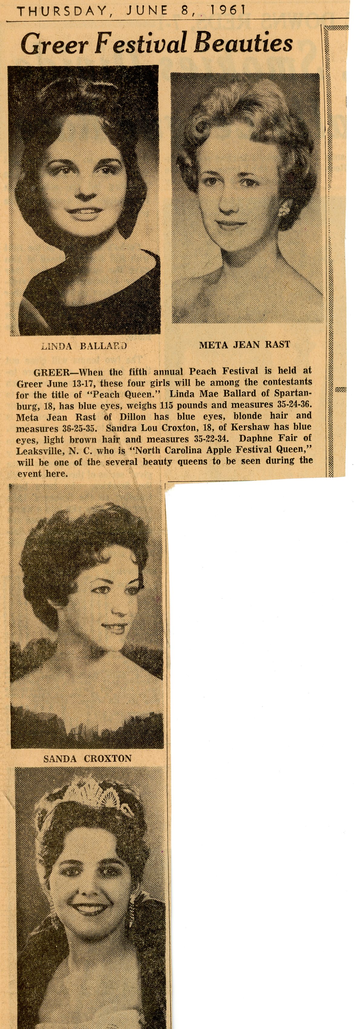 - Article announcing Linda Ballard, Meta Jean Rast, and Sandra Croxton as contestants for the Peach Festival beauty pageant, as well as the presence of N. C. Apple Festival Queen Daphne Fair