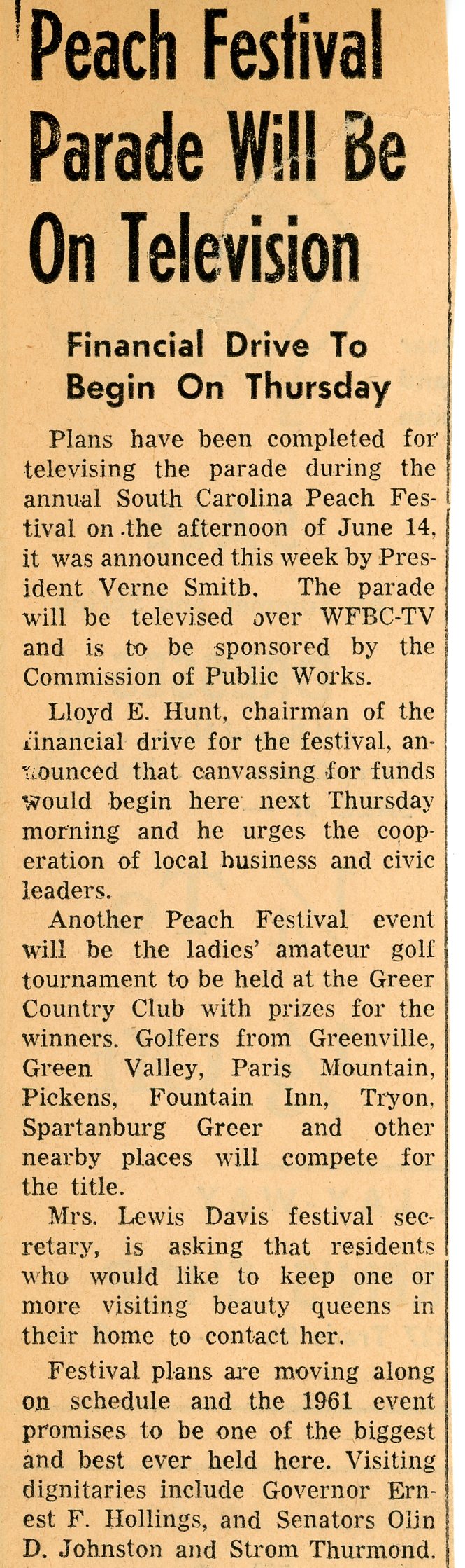 - Article announcing that the 1961 Peach Festival parade will be televised, as well as giving further information about the golf tournament, hosting visiting queens, and visiting dignitaries