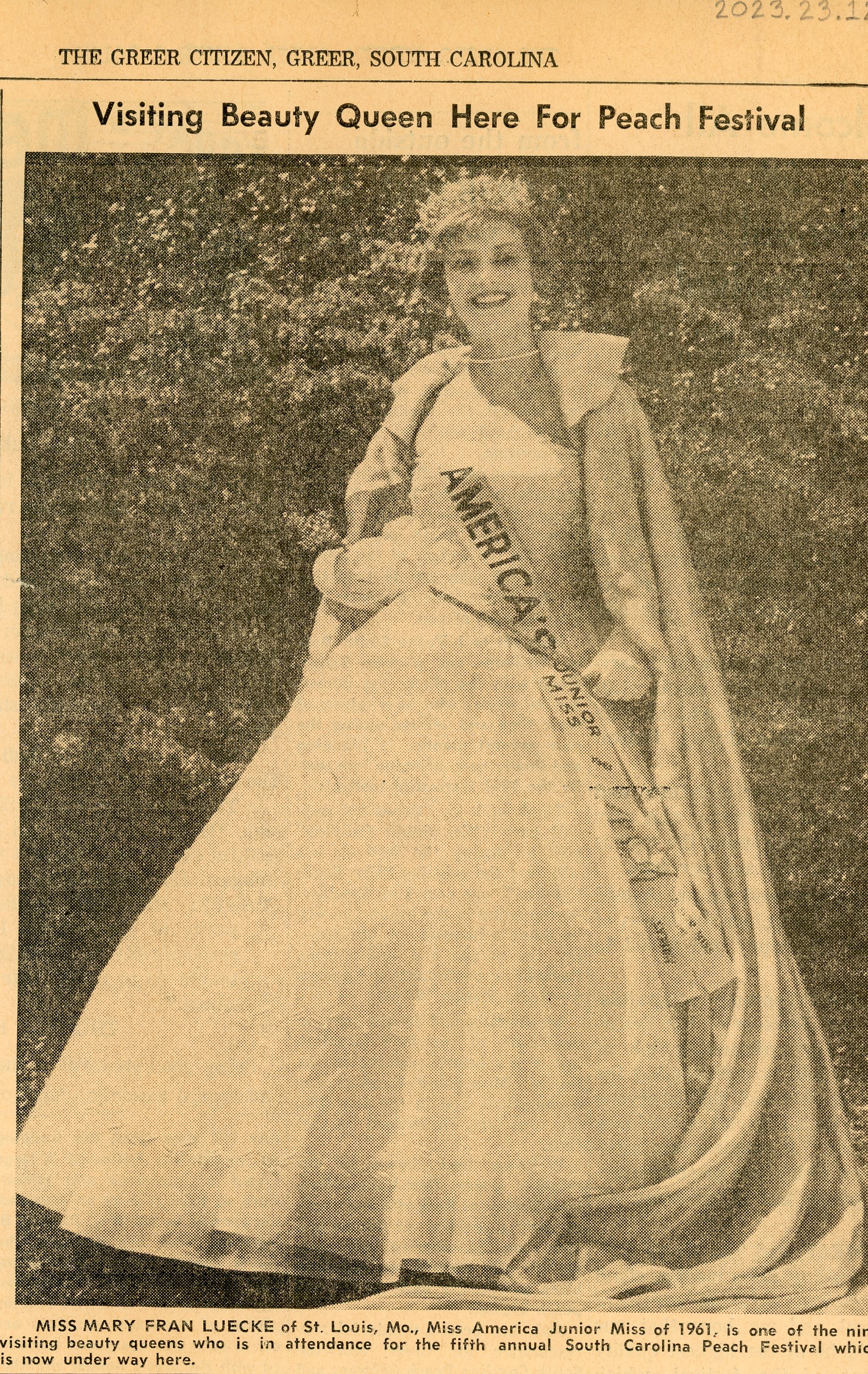 - Newspaper photograph announcing the presence of Mary Fran Luecke, Miss America Junior Miss 1961, at the 1961 Peach Festival