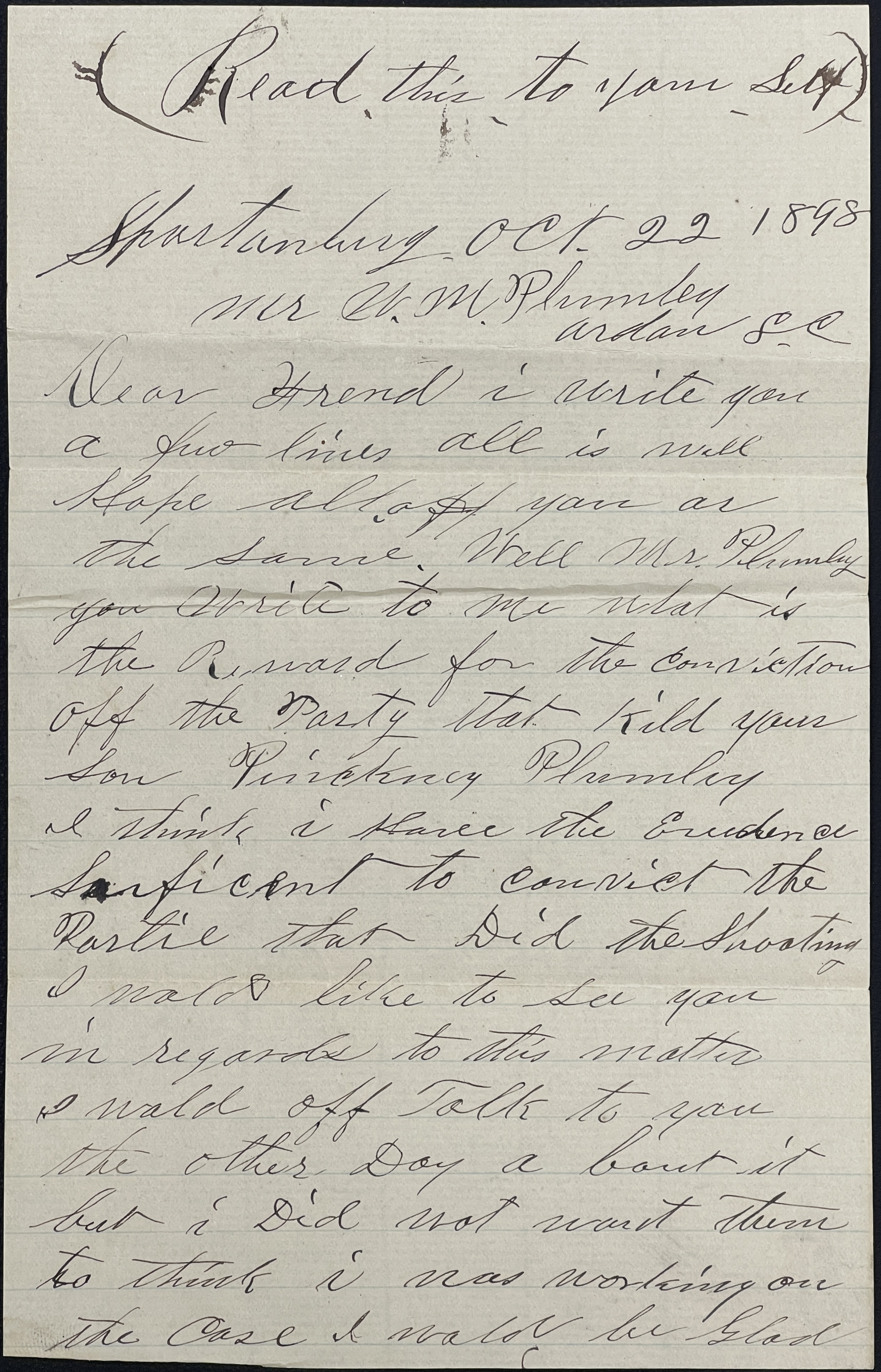 Dear Frend i write you a few lines all is well Hope all off you ar the same. Well Mr. Plumley you Write to me what is the Reward for the conviction off the Party that kild your Son Pinkney Plumley I think i Have the Evidence Suficent to convict the Rastil that Did the Shooting