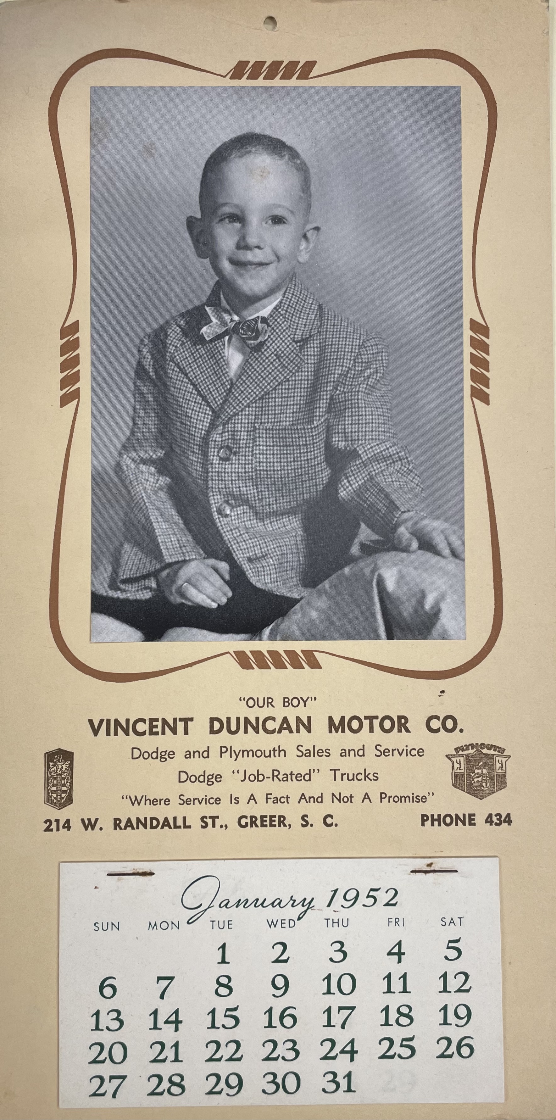 - Promotional calendar from 1952 for Vincent Duncan Motor Company. Photograph of a young boy labeled "Our Boy," believed to be David Duncan.