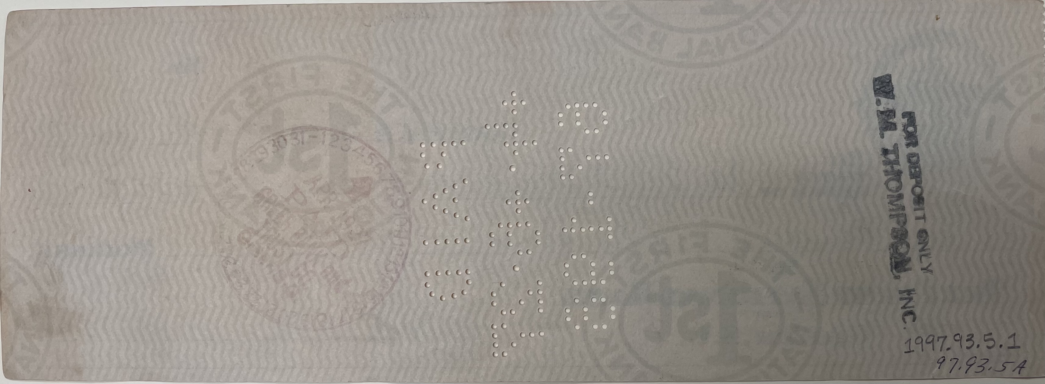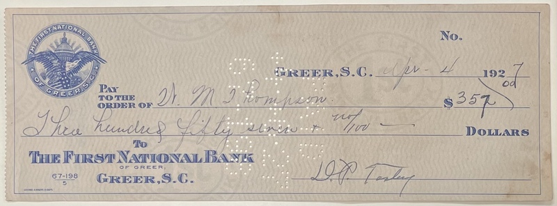- Check from D. P. Tooley to W. M. Thompson, April 4, 1927, for $357.00. Marked as PAID April 6, 1927.