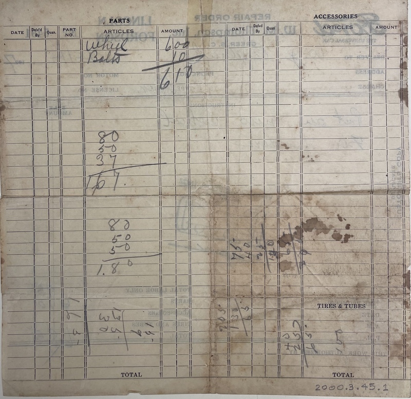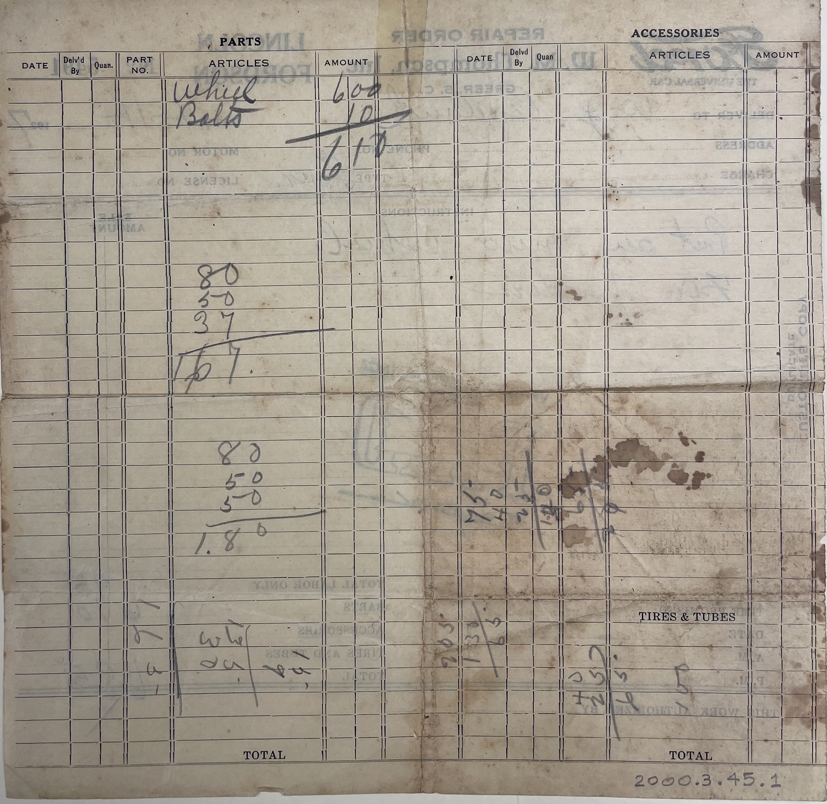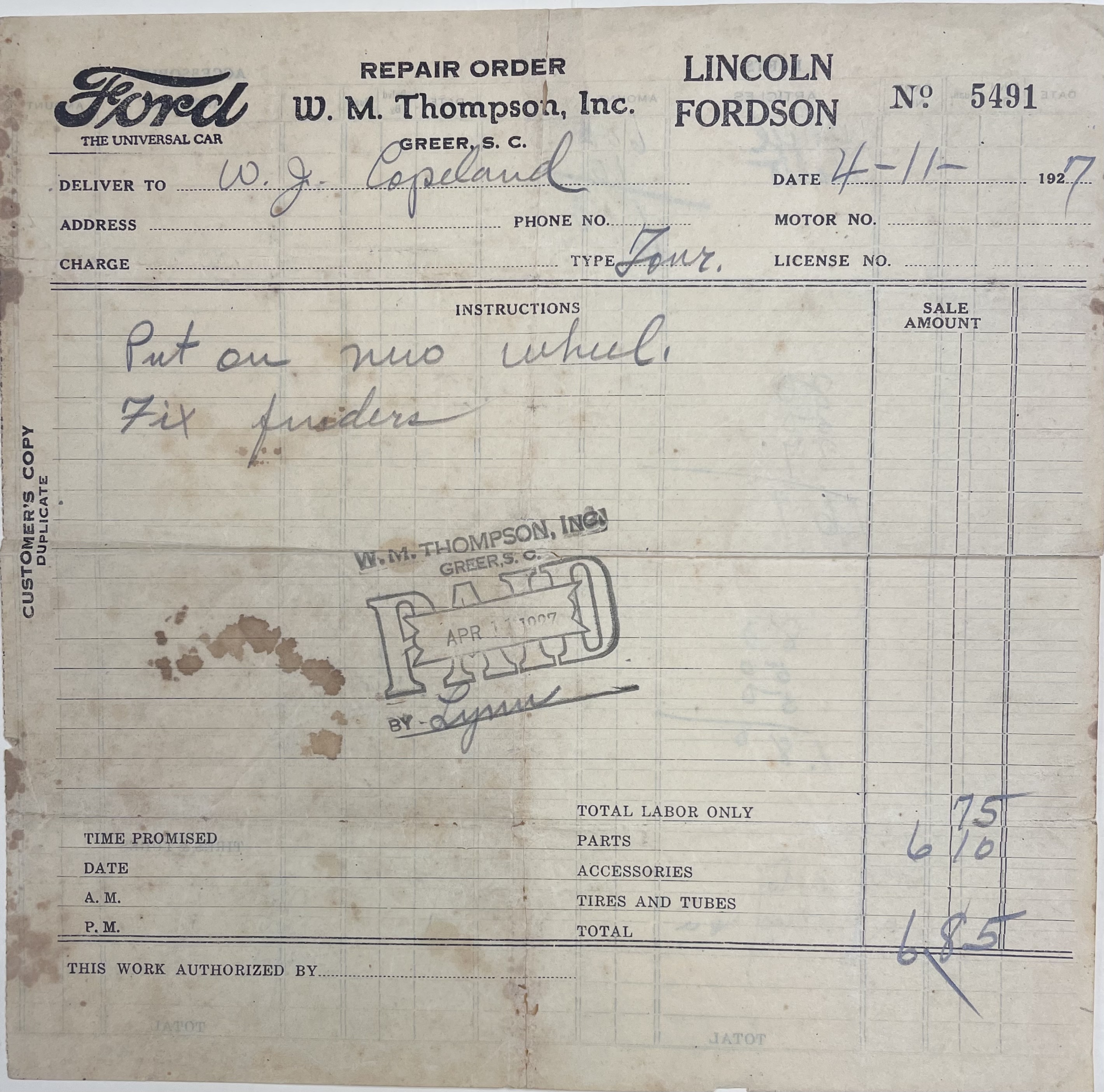 - Repair order and invoice from W. M. Thompson Ford for W. J. Copeland. April 11, 1927.