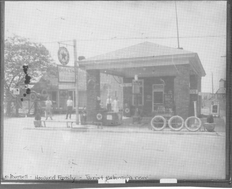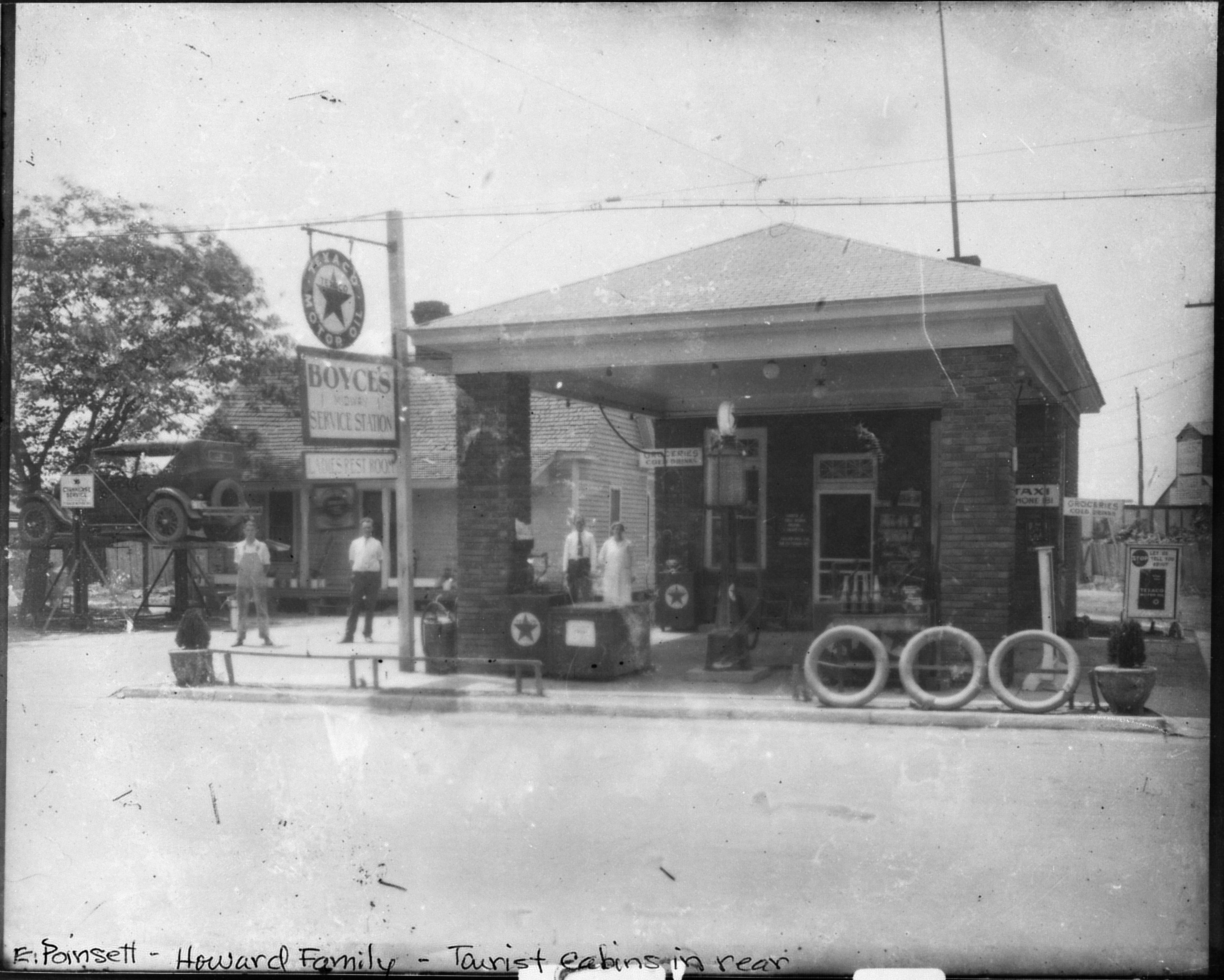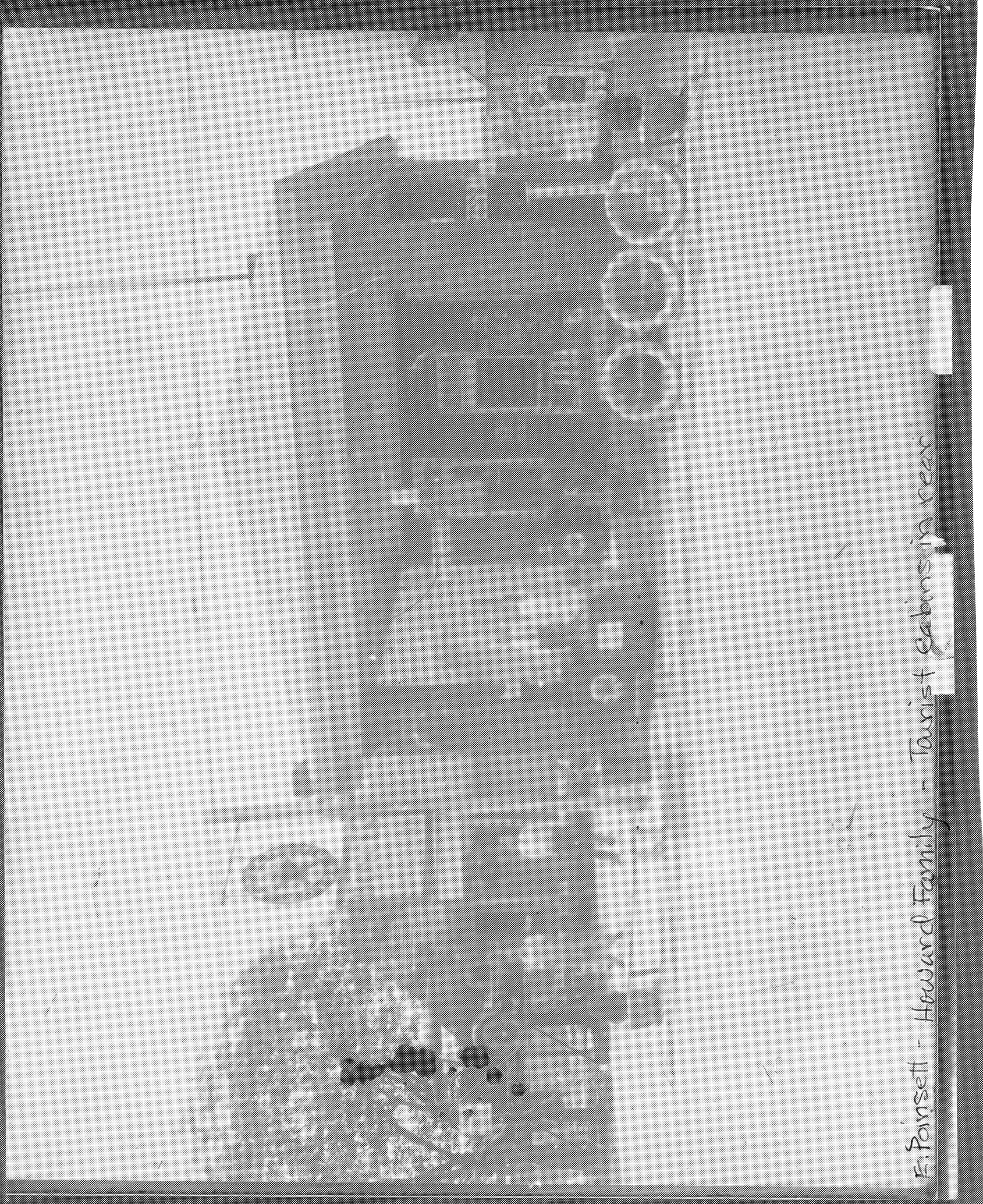 - Screened photo print (likely from Greer Citizen production files) showing Boyce's Service Station. Modern (ball point) handwriting on front: "E. Poinsett - Howard Family - Tourist cabins in rear."