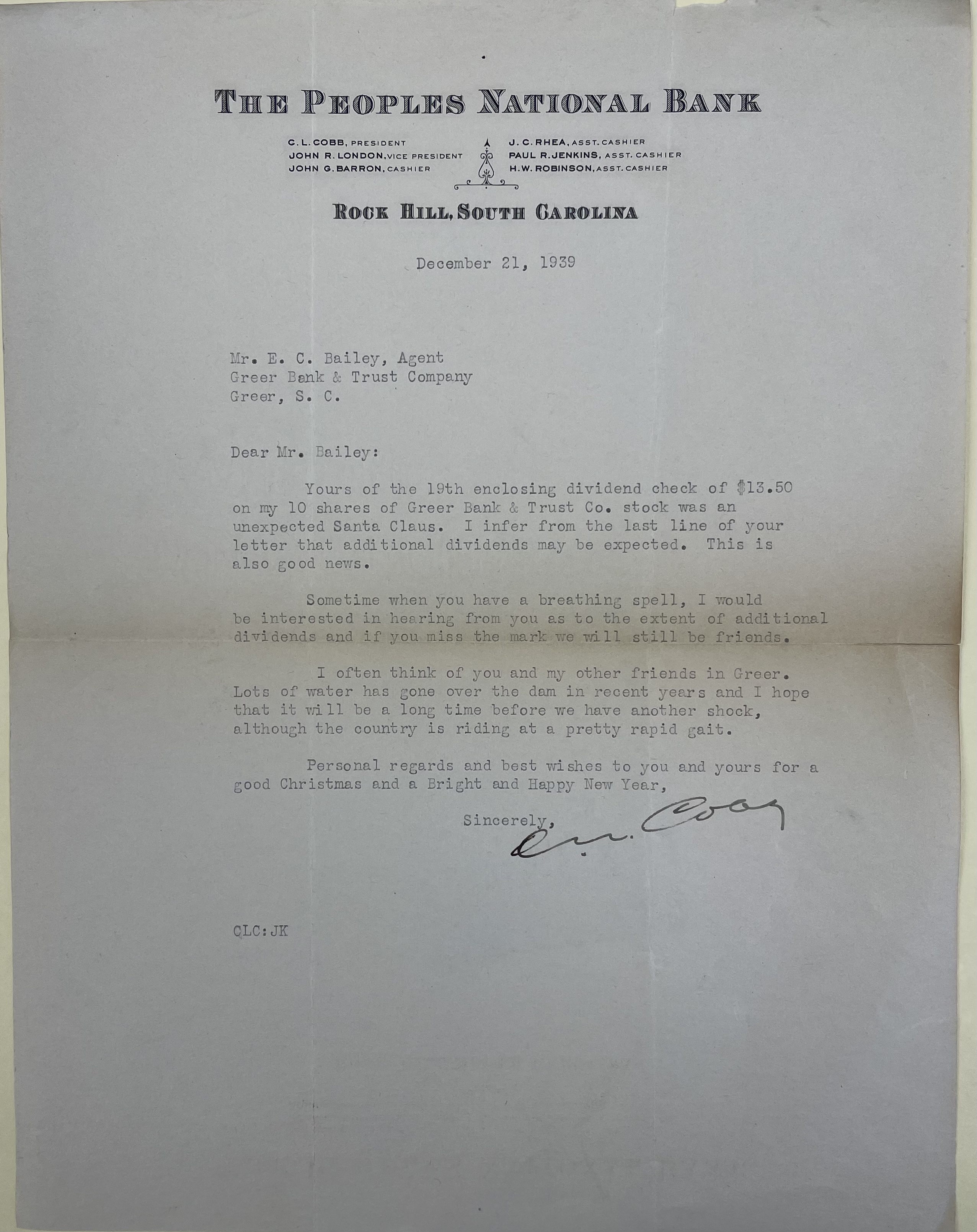 Part of Letter from People's National Bank to E.C. Bailey of Greer Bank & Trust