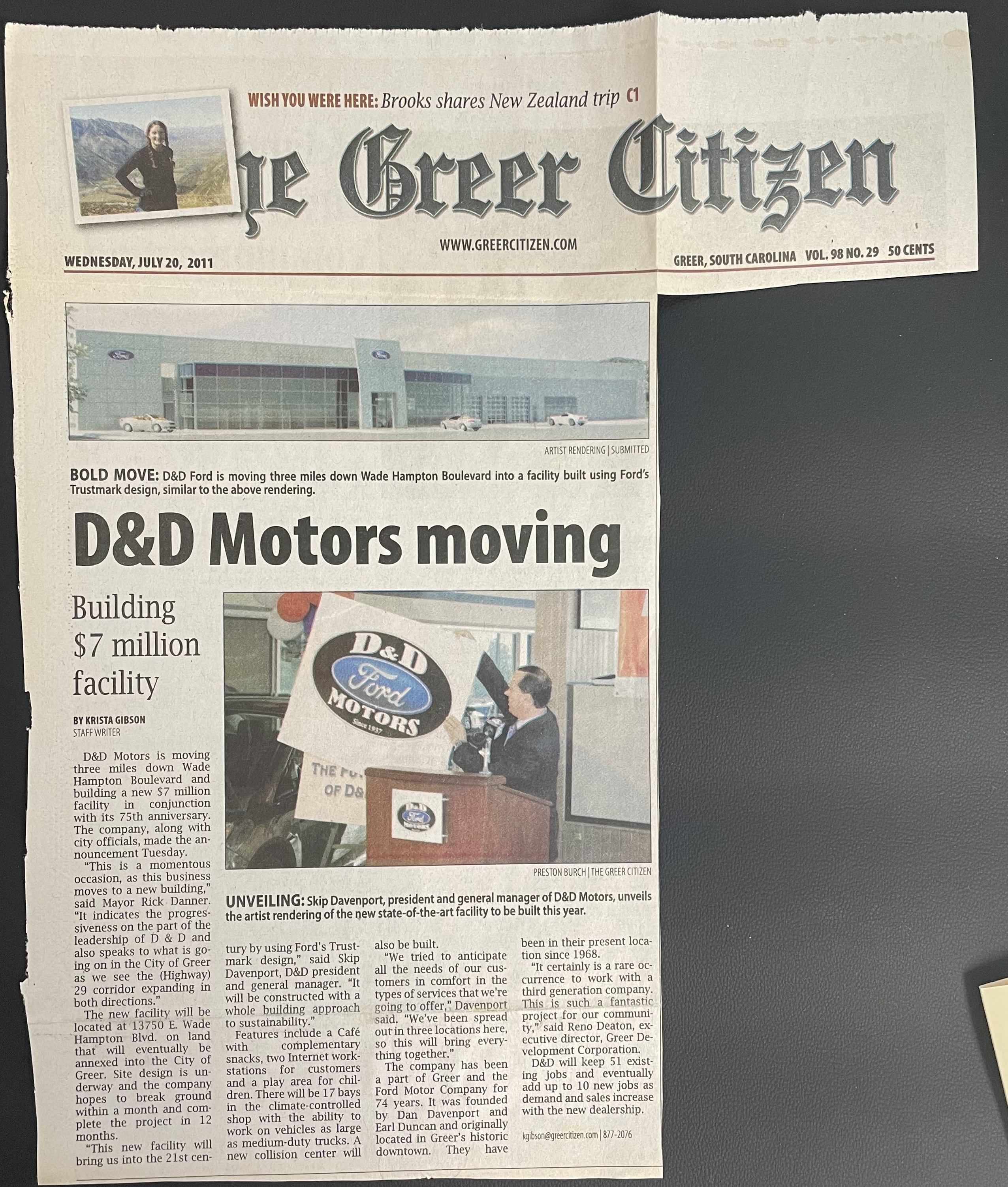 D&D Motors is moving three miles down Wade Hampton Boulevard and building a new $7 million facility in conjunction with its 75th anniversary. The company, along with city officials, made the announcement Tuesday. "This is a momentous occasion, as this business moves to a new building." said Mayor Rick Danner. "It indicates the progressiveness on the part of the leadership of D & D and also speaks to what is going on in the City of Greer as we see the (Highway) 29 corridor expanding in both directions."