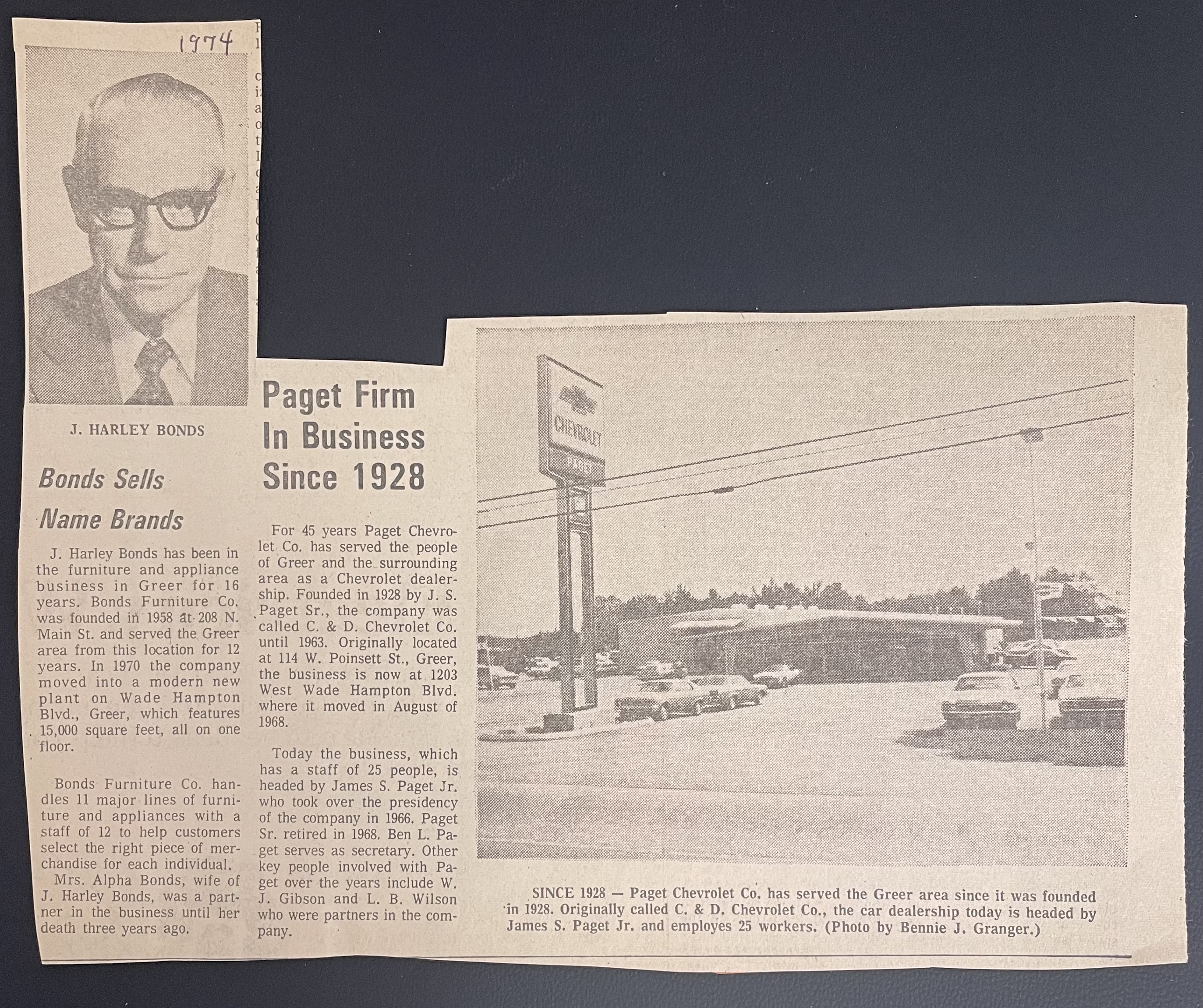 - Newspaper clipping about J. Harley Bonds, Bonds Furniture Co., and Paget Chevrolet Co.