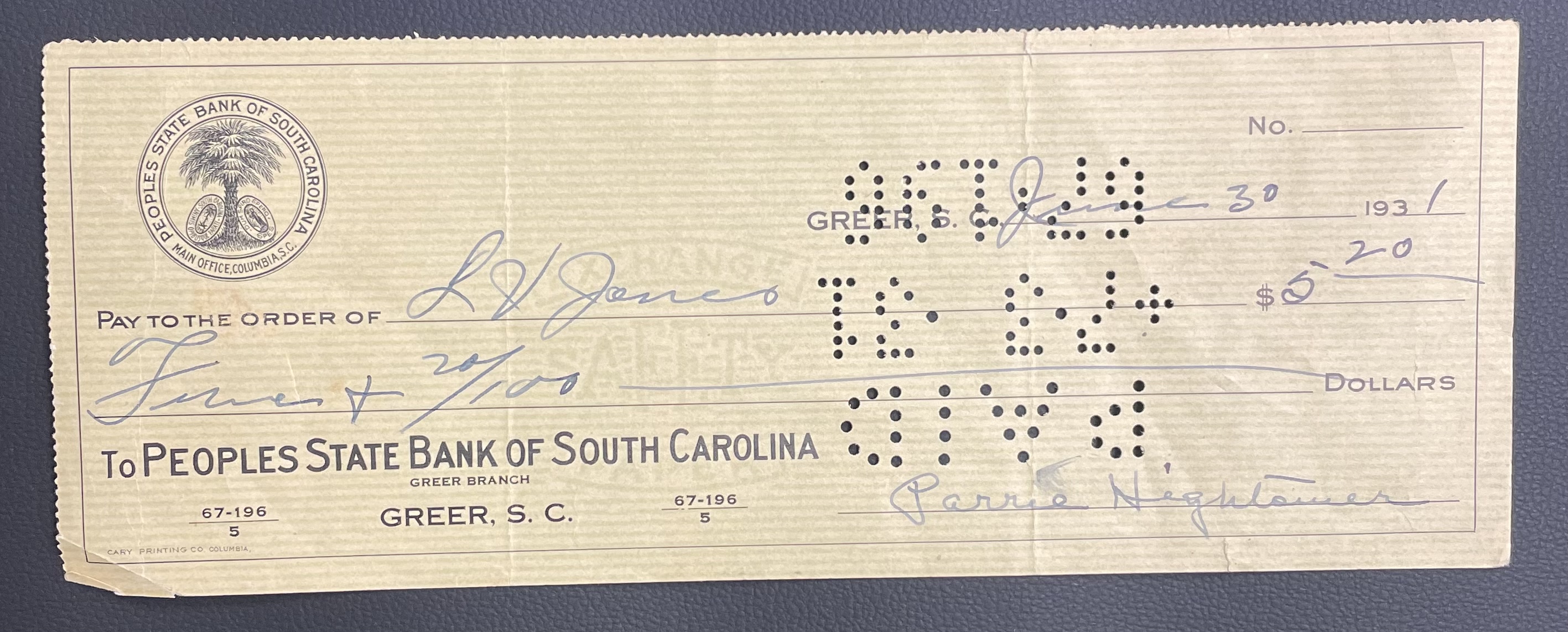 - Peoples State Bank check to L.V. Jones from Parrie Hightower
