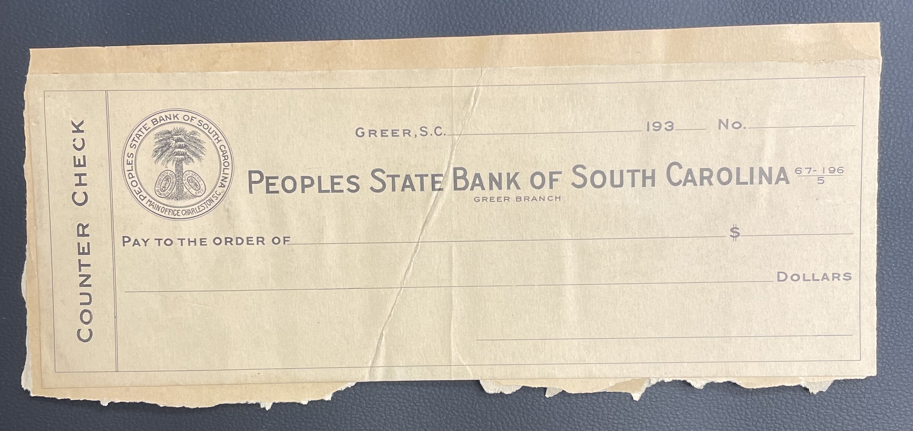 - Blank check from the Peoples State Bank of South Carolina pasted on a piece of cardstock