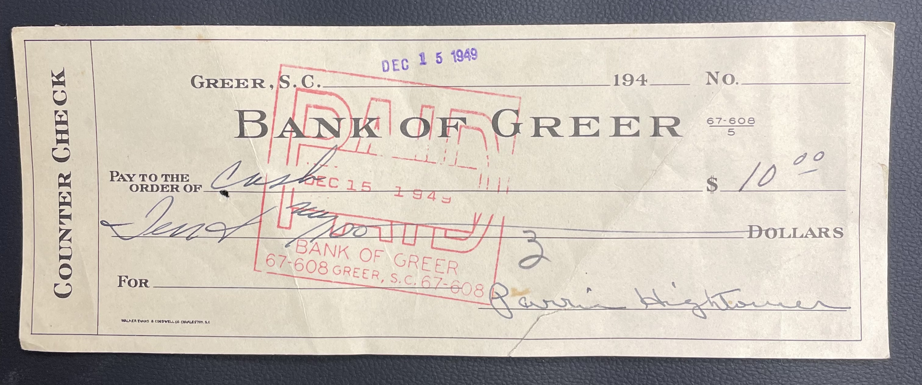Bank of Greer counter check for Parrie Hightower