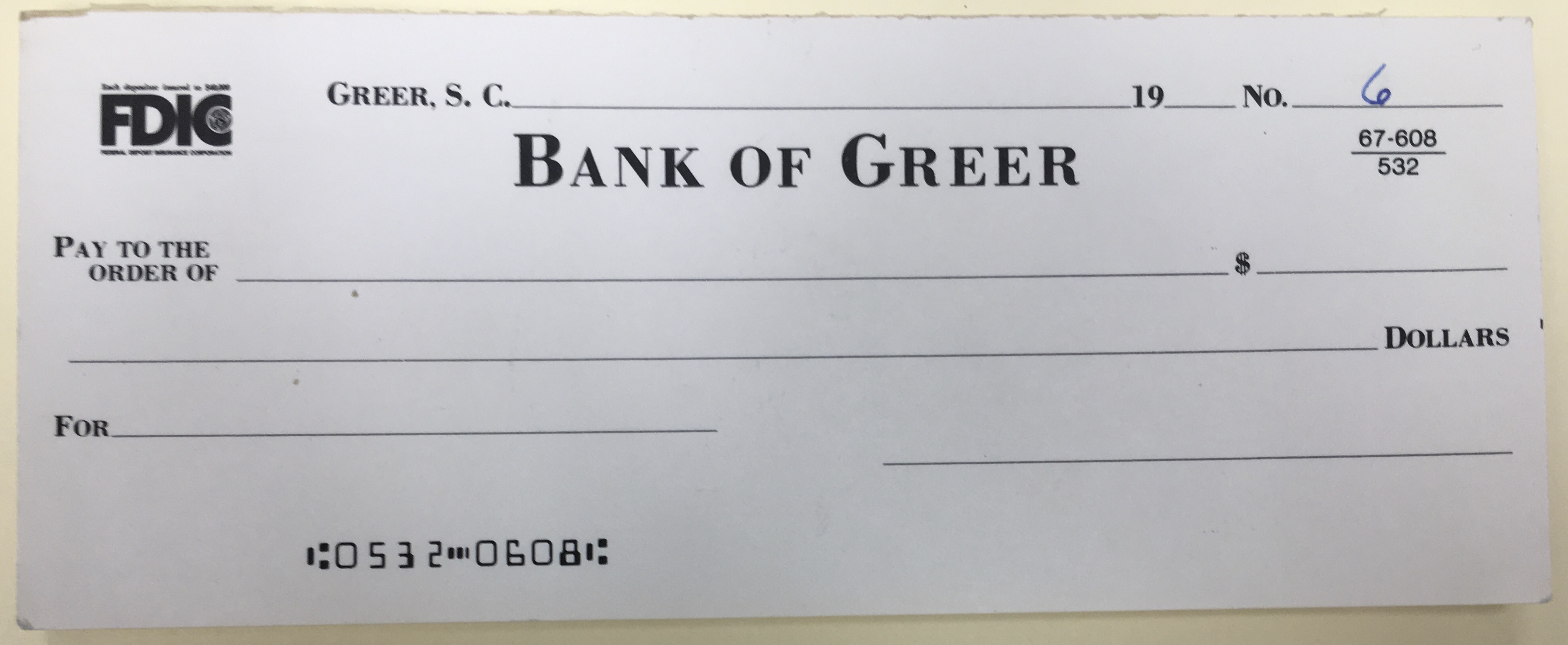Bank of Greer block of blank checks