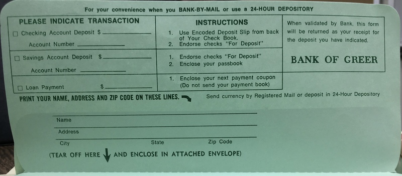 Bank of Greer unused mail teller envelope