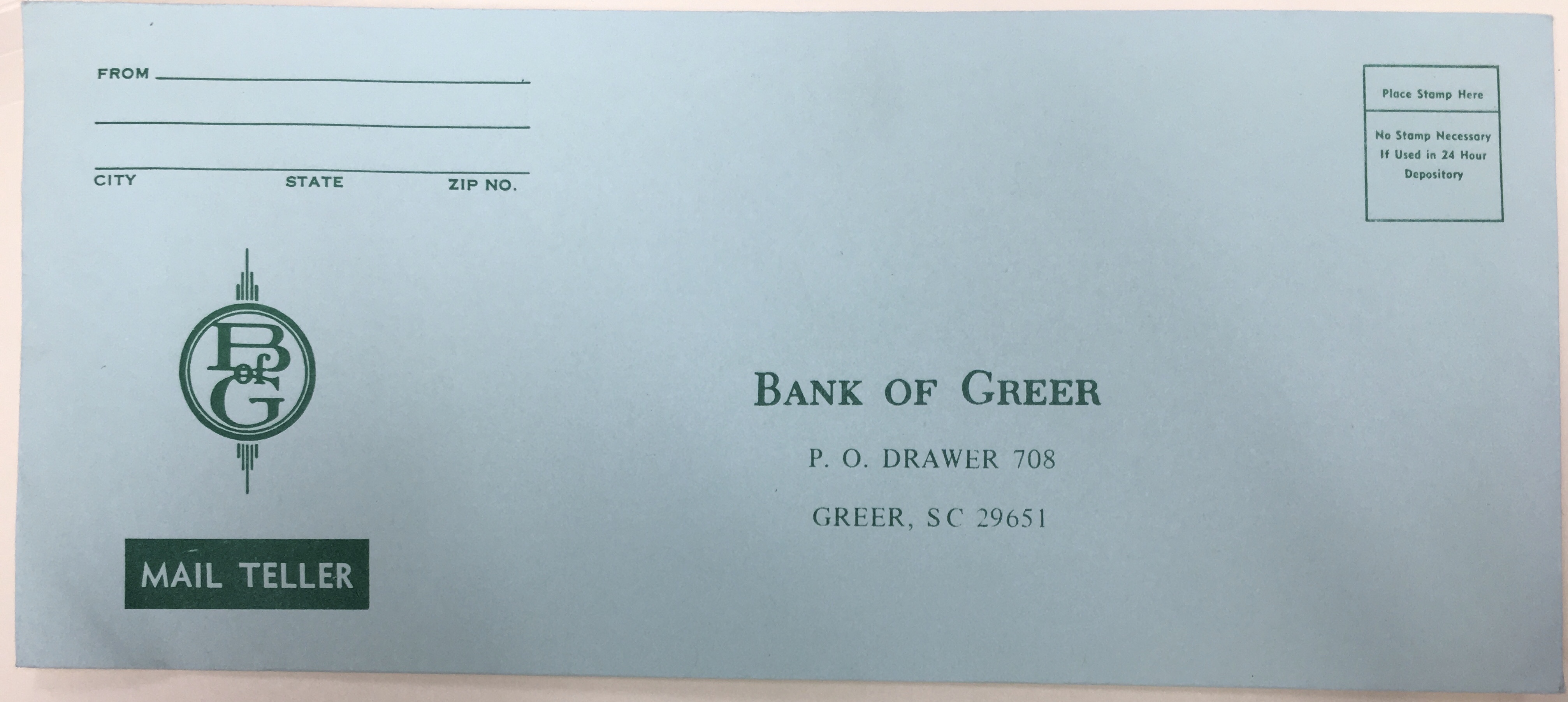 - Bank of Greer unused mail teller envelope