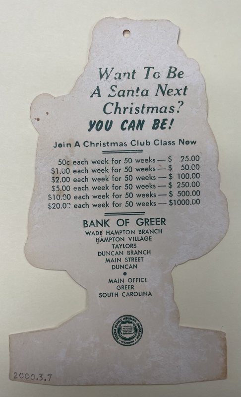 - Christmas Card and advertisement for Christmas Club classes from the Bank of Greer.