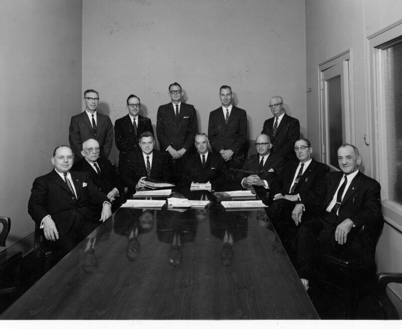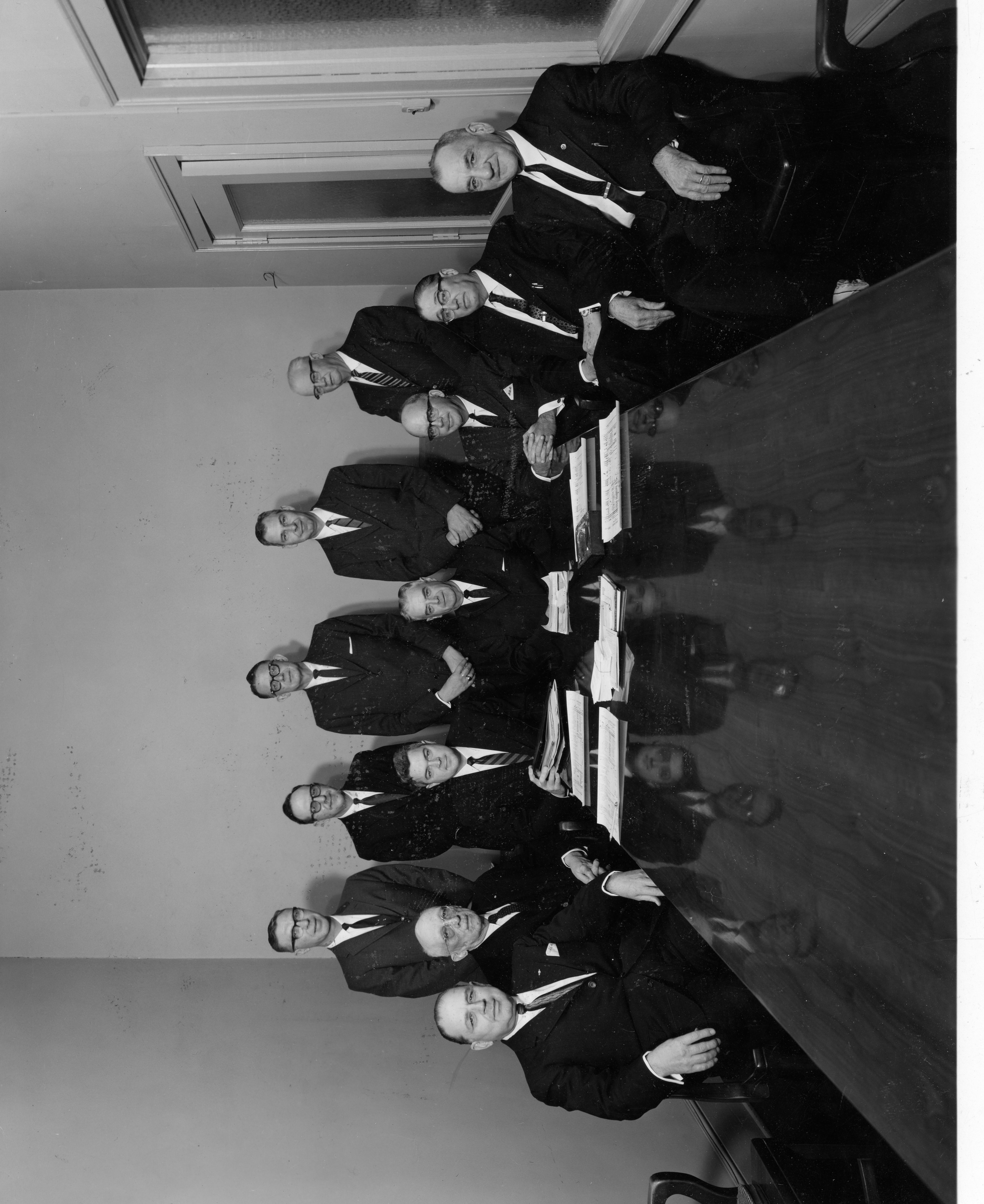Standing left to right: John McMurray, Marion Lanford, R.H. Wood, Dennis Dobson, Earle Taylor.