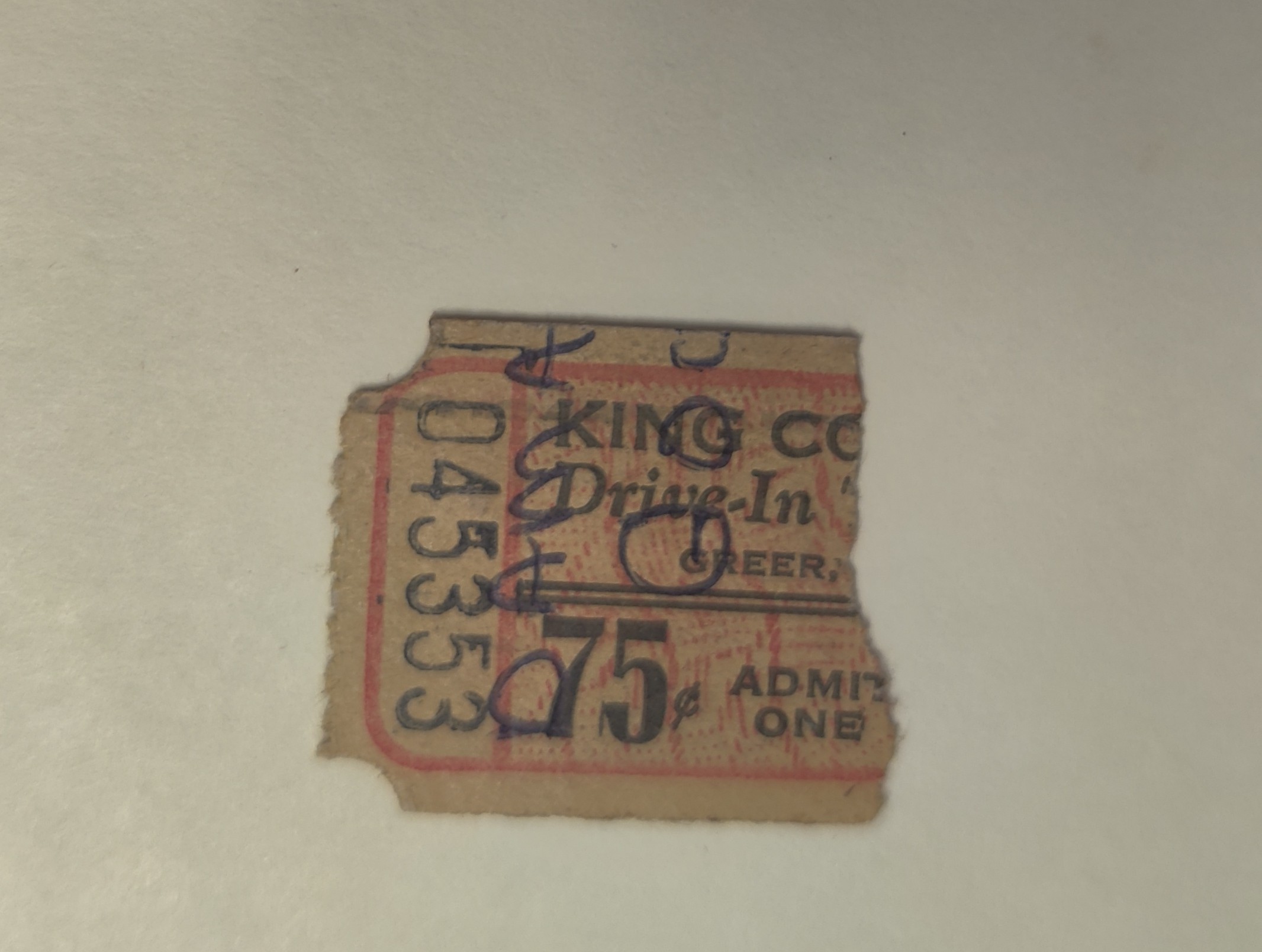 - A torn ticket stub for King Cotton Drive-In Theatre in Greer, South Carolina. The ticket cost 75¢.