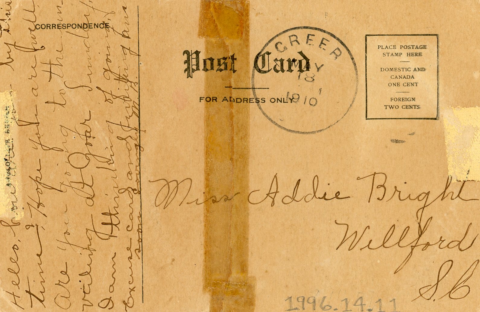 - Postcard for Addie Bright in Wellford, S.C. post dated 1910.