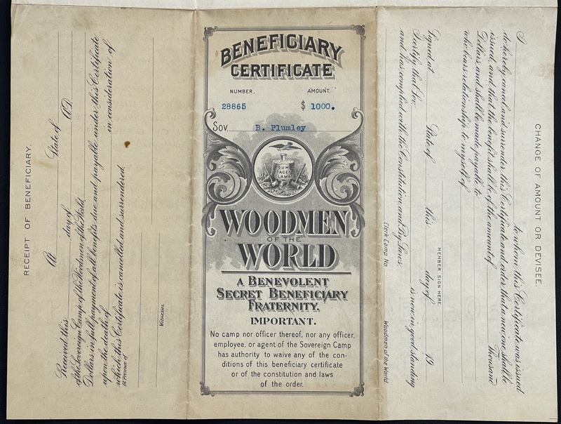 - Woodmen of the World Beneficiary Certificate for Benjamin Plumley