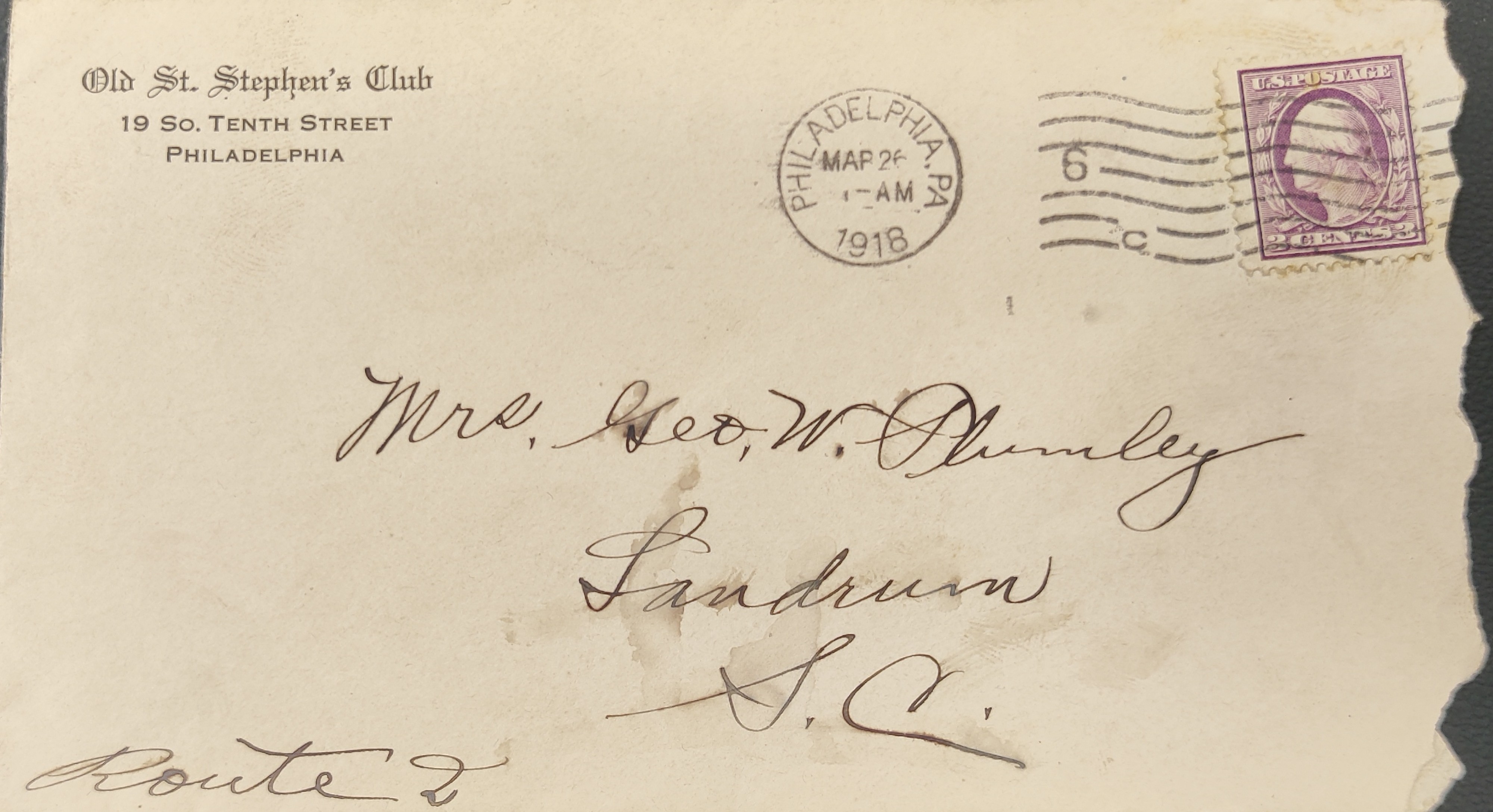 Part of Envelope from Old St. Stephen's Club to Mrs. G.W. Plumley